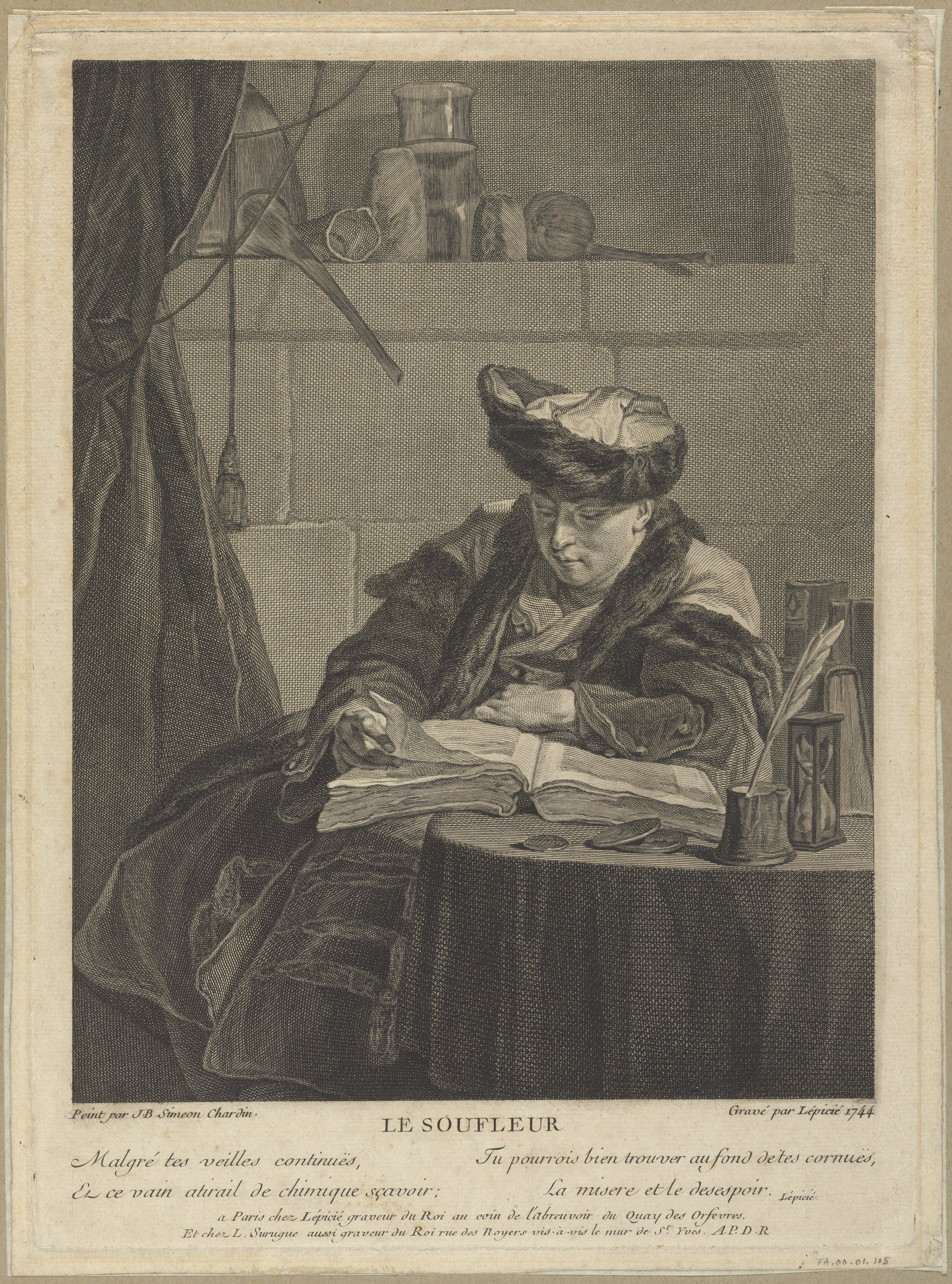 This engraving by François Bernard Lépicié reproduces the painting by Jean-Baptiste-Siméon Chardin. A young man in a fur-trimmed cap and robe sits reading, surrounded by books and glassware. On the shelf above sit long-necked alembics for distillation. At his elbow sits a small hourglass, reminding the viewer of time's passage.