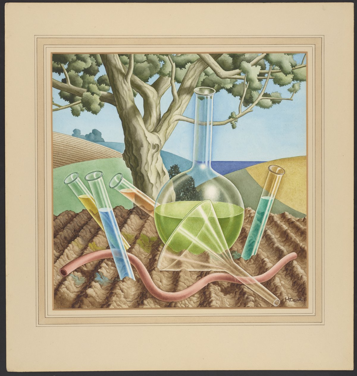 A landscape in watercolor, featuring a farm scene with a large tree that spreads its branches across the top of the image. At bottom, a planted field in rows. Superimposed on the landscape is a large glass bottle, a glass funnel, and a quartet of test tubes, filled with clear green and blue liquids. The image celebrates the advances in farm chemistry and agricultural science during the first half of the twentieth century.