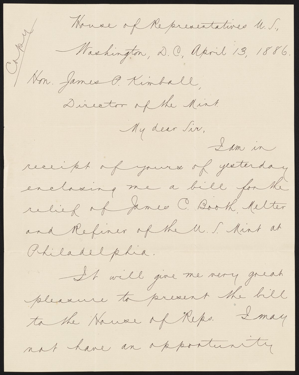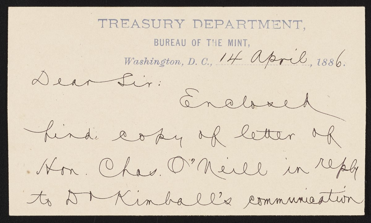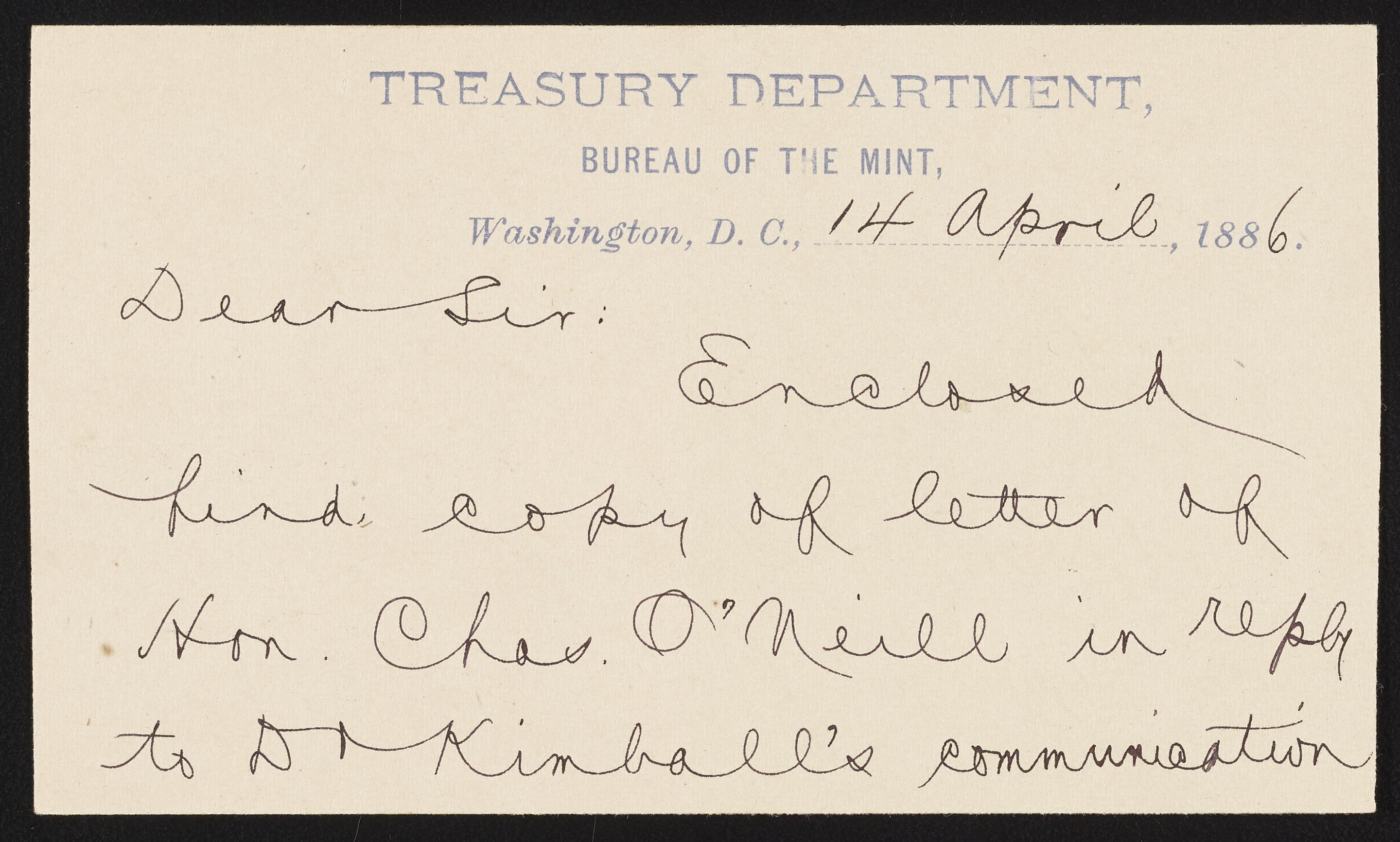 Small JPG1200 x 722px — 122 KBLarge JPG2880 x 1732px — 668 KBFull-sized JPG2980 x 1792px — 712 KBOriginal fileTIFF — 2980 x 1792px — 15.3 MBLetter from H. E. Spackman of the United States Treasury to James Curtis Booth (1810-1888) enclosing a copy of a letter from Charles O'Neill (1821-1893) member of the U.S. House of Representatives. O'Neill's letter was written in reply to James P. Kimball's (1836-1913) communication pertaining to a bill for Booth's relief.