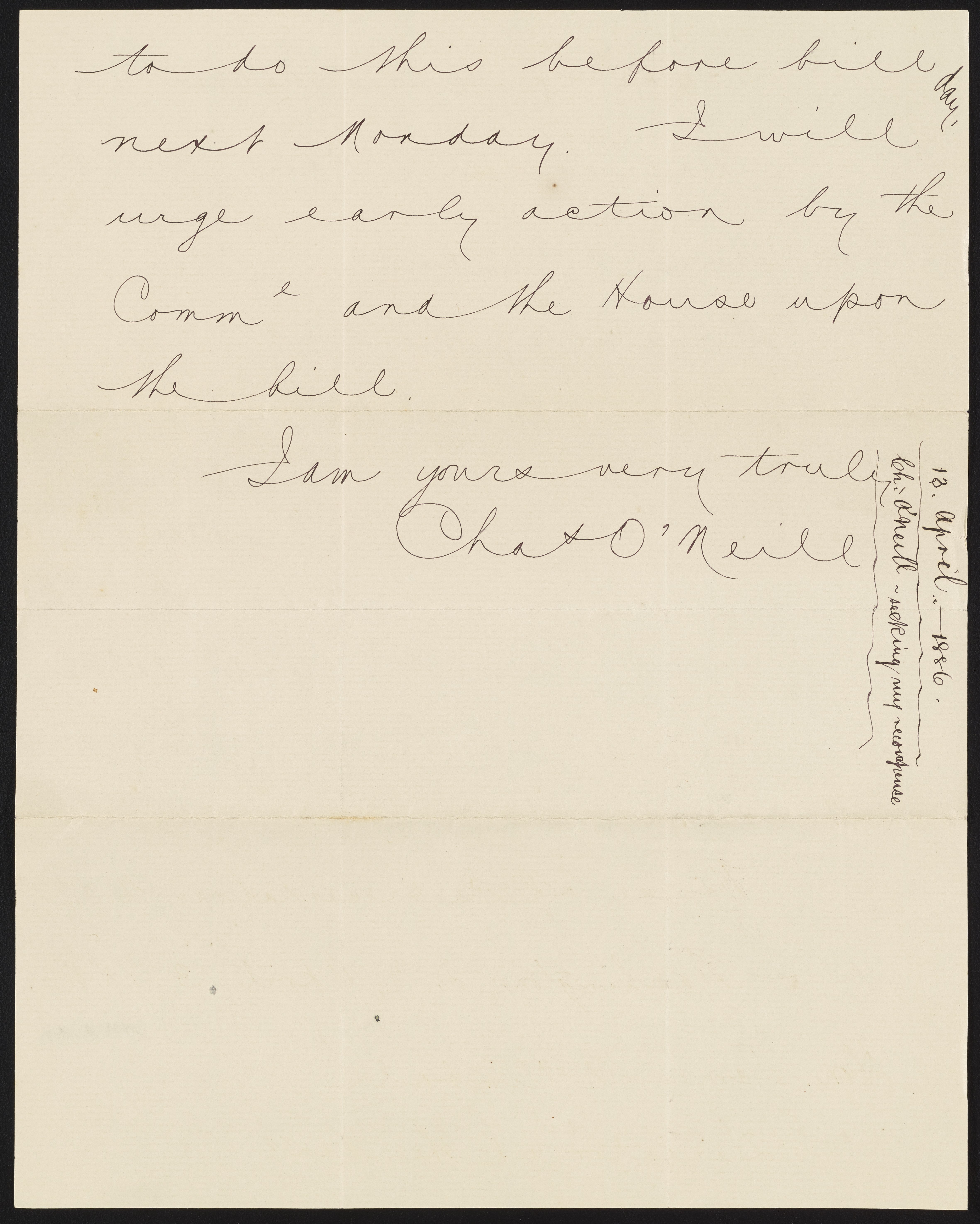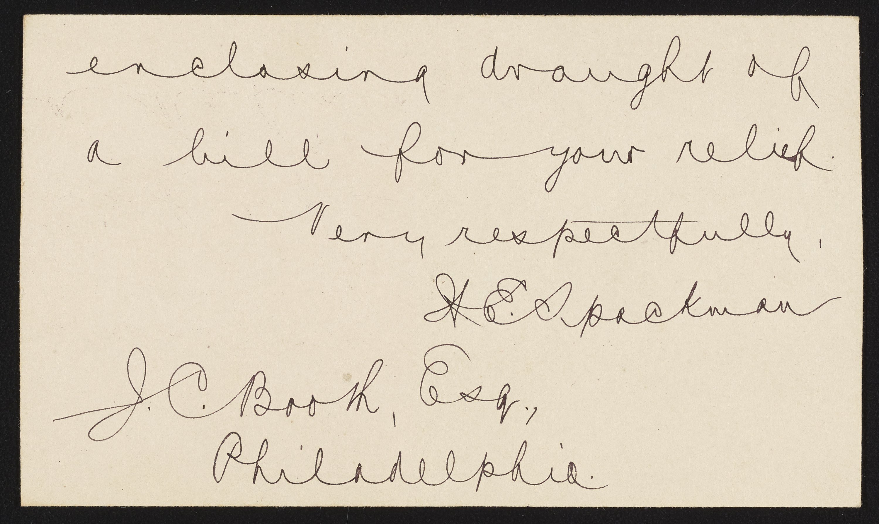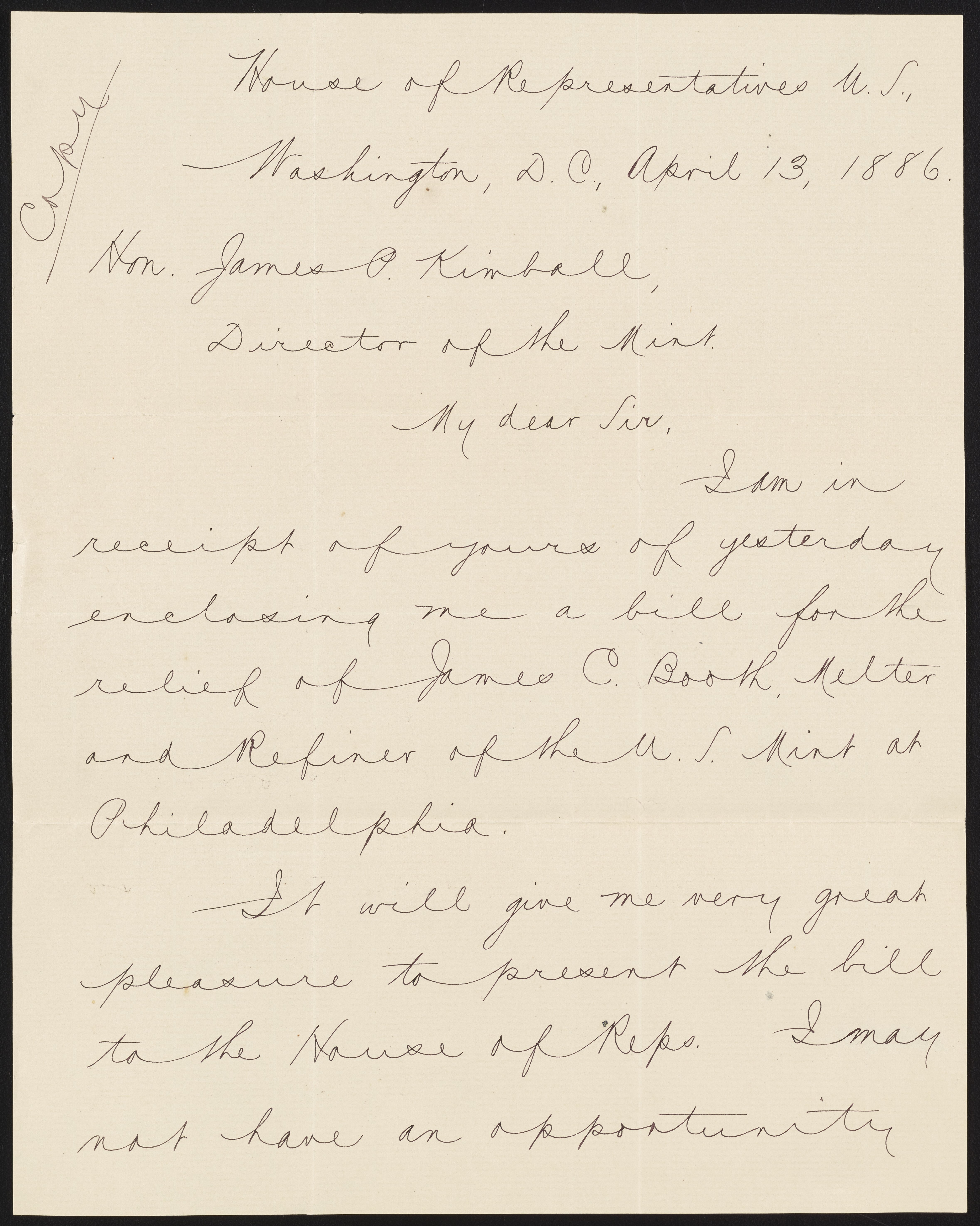Small JPG1200 x 722px — 122 KBLarge JPG2880 x 1732px — 668 KBFull-sized JPG2980 x 1792px — 712 KBOriginal fileTIFF — 2980 x 1792px — 15.3 MBLetter from H. E. Spackman of the United States Treasury to James Curtis Booth (1810-1888) enclosing a copy of a letter from Charles O'Neill (1821-1893) member of the U.S. House of Representatives. O'Neill's letter was written in reply to James P. Kimball's (1836-1913) communication pertaining to a bill for Booth's relief.