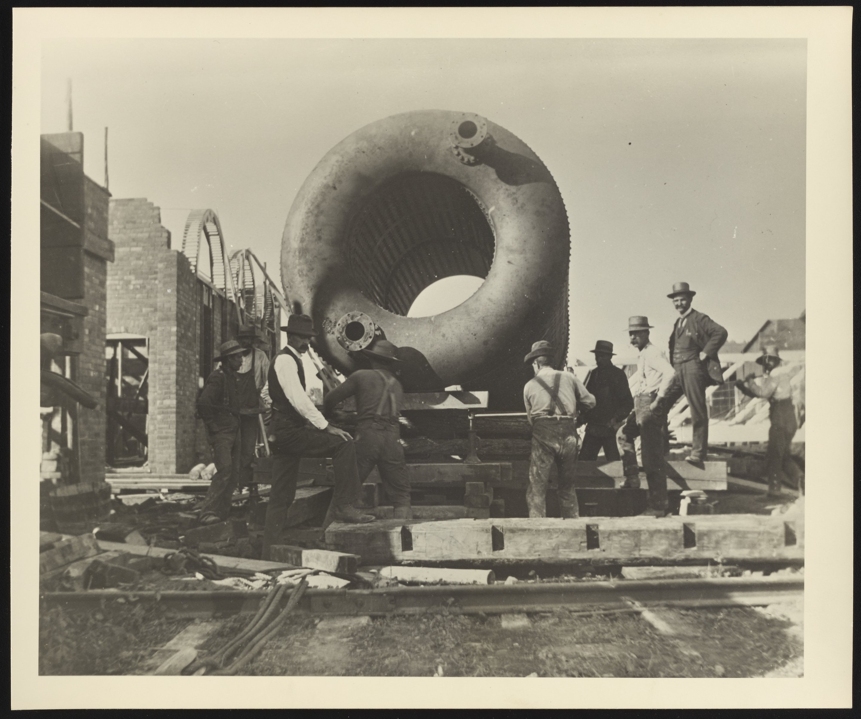 General view of the Dow Chemical Company's first Berry Safety Boiler being delivered to the Plant A Power House at the company's facilities in Midland, Michigan. Two of the individuals visible in the photograph are identified as follows: Superintendent M.B. Johnson (left center wearing a white shirt) and Foreman Mr. Wilbur (right center).