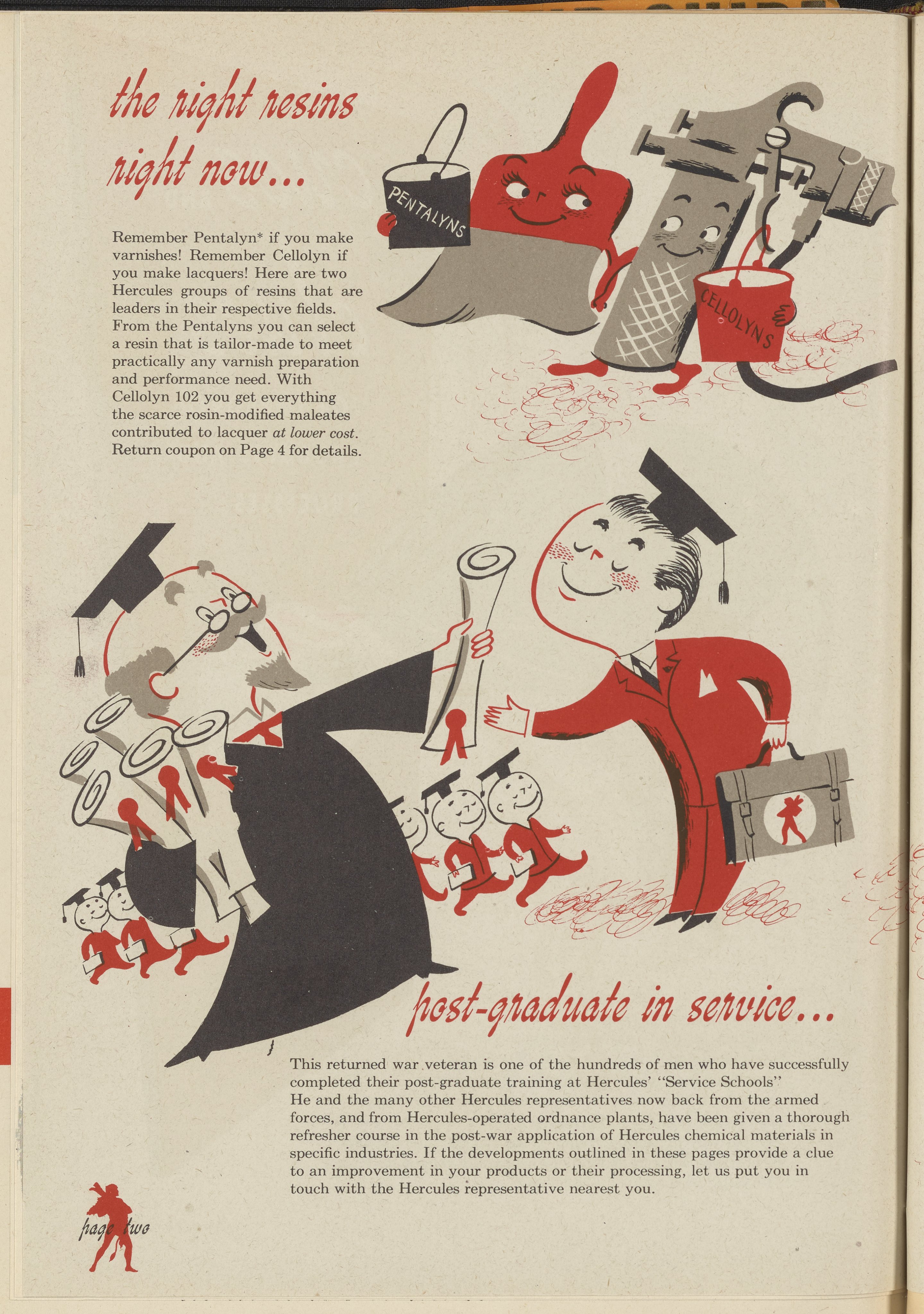 Hercules Incorporated. “Cues and Clues for Improved Products and Processes.” 1946 Hercules Advertisements, 1946. Records of Hercules Incorporated, Volume 1946. Science History Institute. Philadelphia. https://digital.sciencehistory.org/works/2z3ht7h.