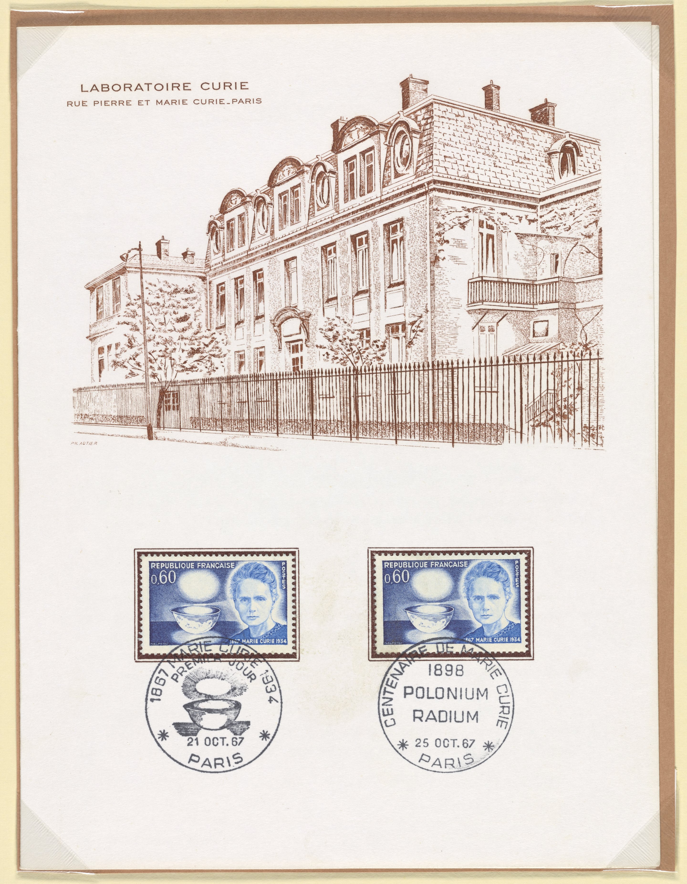 Autier, Ph., and Jean Pheulpin. “Postcard with French Postal Stamps Commemorating the Centenary of the Birth of Marie Curie.” France, 1967. Witco Stamp Collection, Box 2. Science History Institute. Philadelphia. https://digital.sciencehistory.org/works/3197xm259.