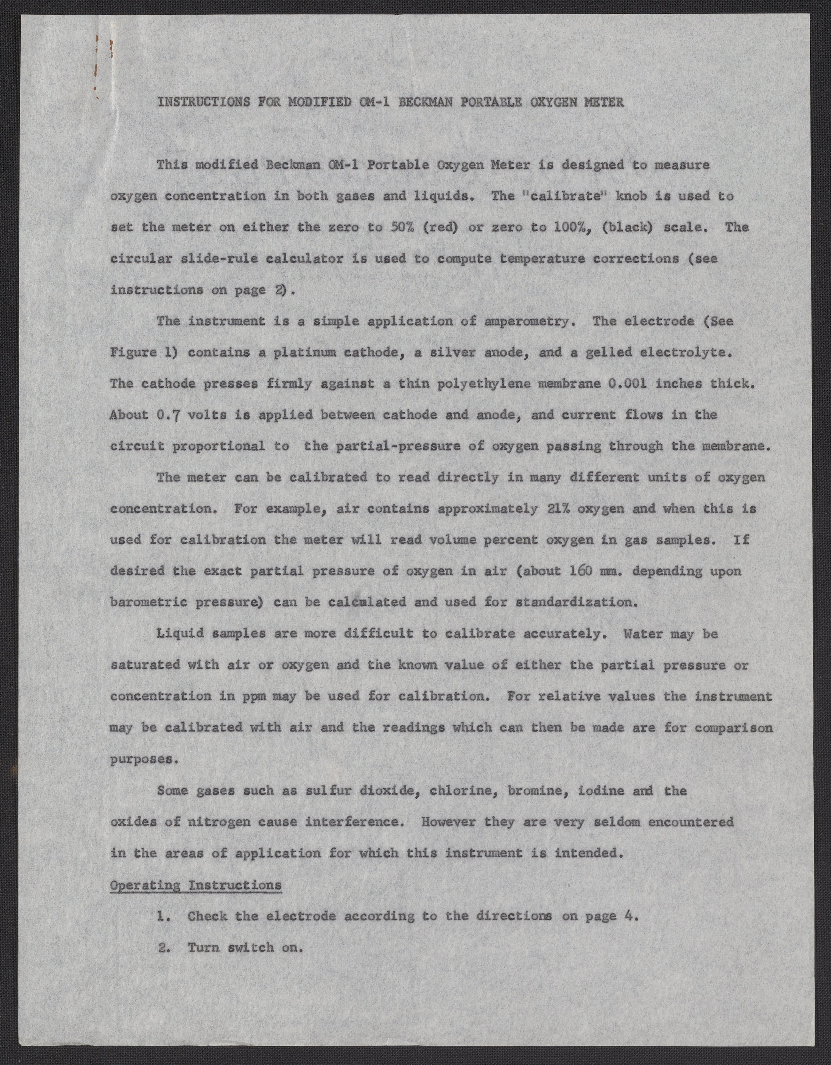 Instructions for Modified OM-1 Beckman Portable Oxygen Meter