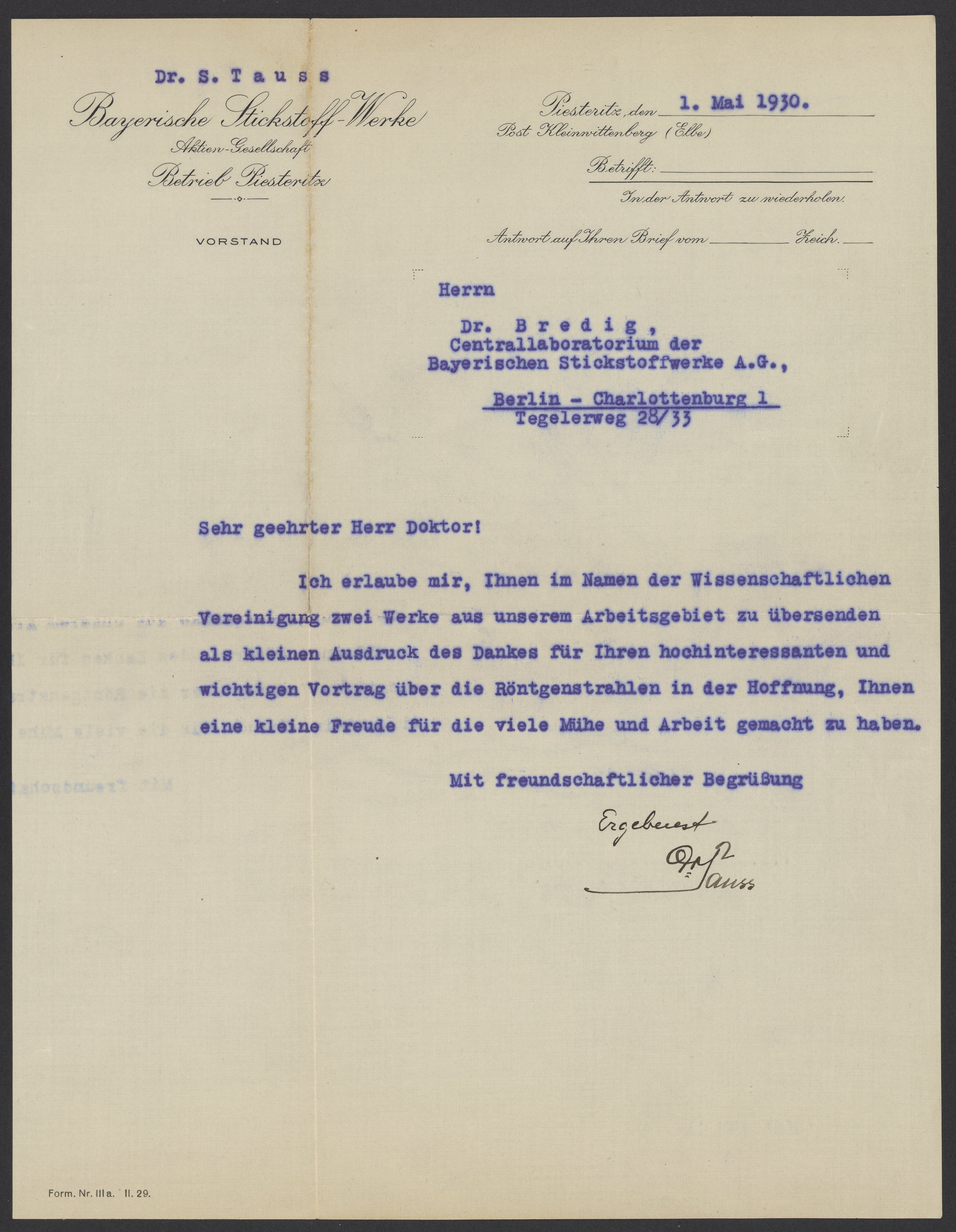 Tauss, Sigfried. “Letter from Siegfried Tauss to Max Bredig,” May 1, 1930. Papers of Georg and Max Bredig, Box 2, Folder 56. Science History Institute. Philadelphia. https://digital.sciencehistory.org/works/32ykd5w.