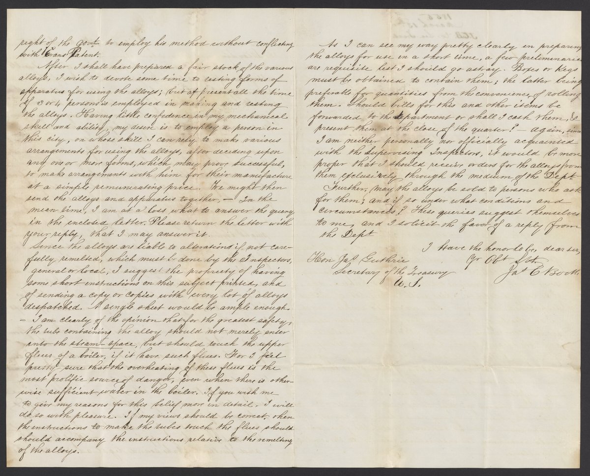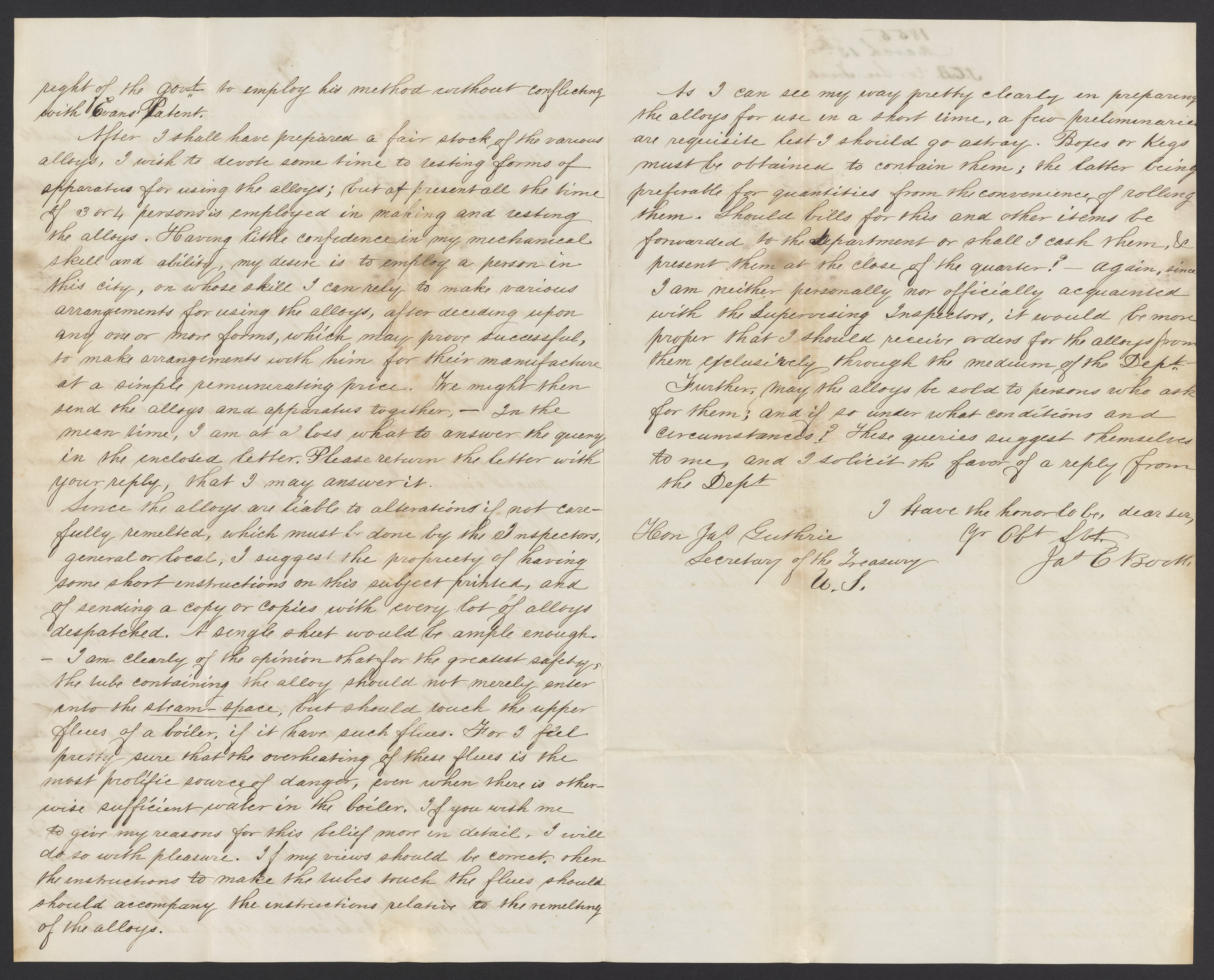 Small JPG1200 x 1875px — 424 KBLarge JPG2880 x 4500px — 1.7 MBFull-sized JPG3374 x 5272px — 2.3 MBOriginal fileTIFF — 3374 x 5272px — 50.9 MBJames Curtis Booth (1810-1888), melter and refiner of the United States Mint, writes to James Guthrie (1794-1869), Secretary of the Treasury, to discuss the production of fusible alloys.