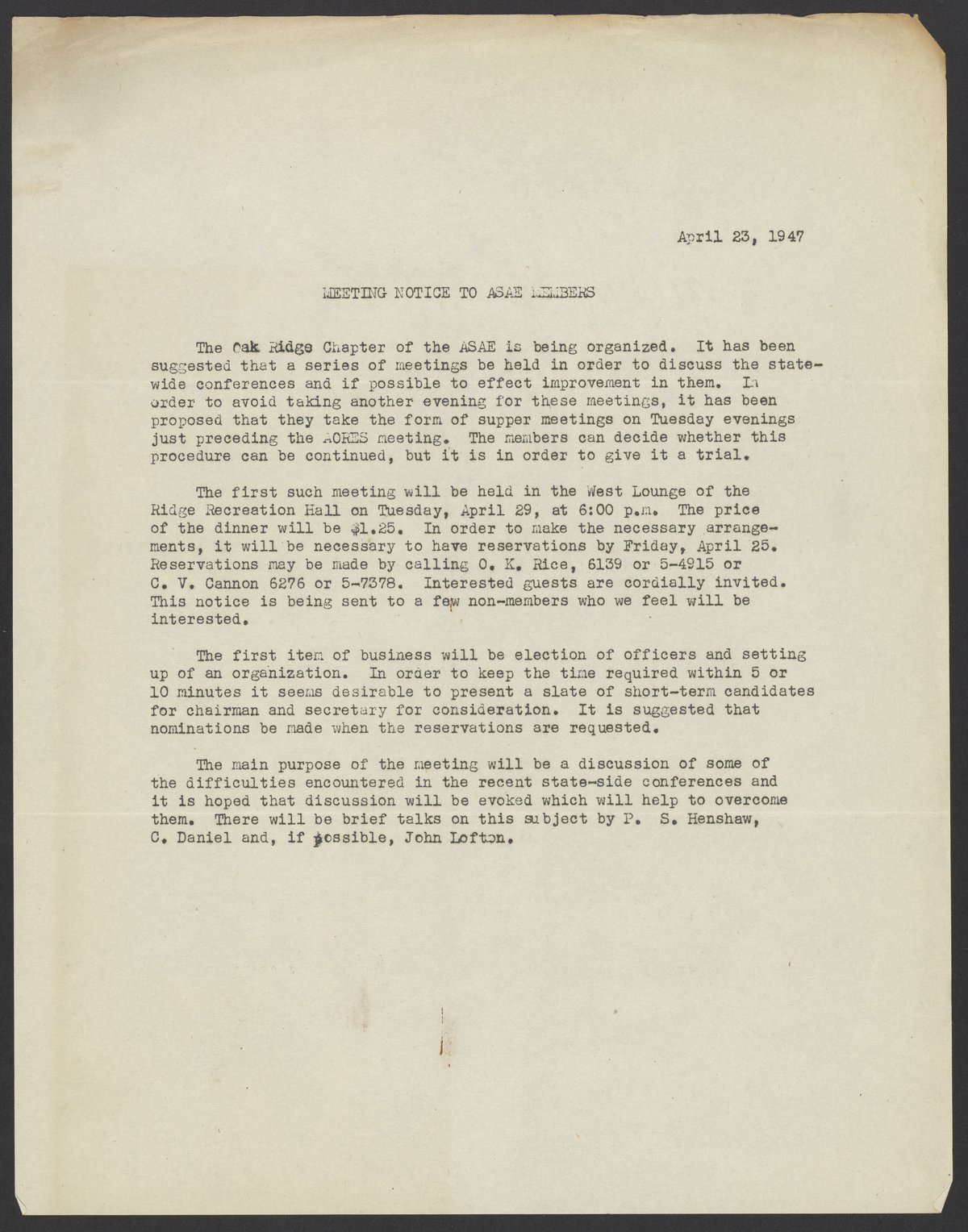 Meeting notice for the Association of Scientists for Atomic Education (ASAE). The meeting was held to elect officers and set up the Oak Ridge Chapter of ASAE.