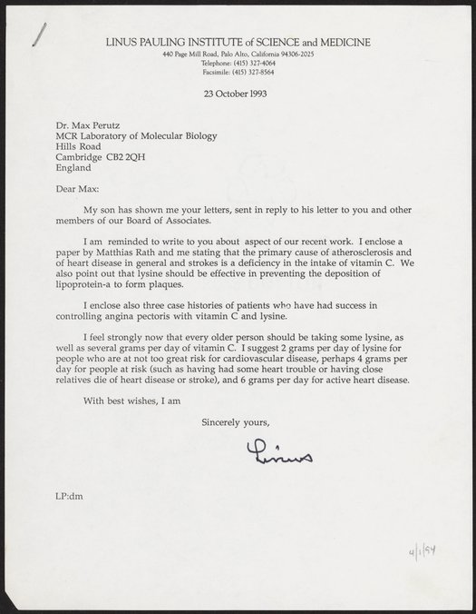 Pauling, Linus. “Letter from Linus Pauling to Max Perutz, October 23, 1993,” October 23, 1993. History of Molecular Biology Collection, Box 78, Folder 5. Science History Institute. Philadelphia. https://digital.sciencehistory.org/works/34o48kr.