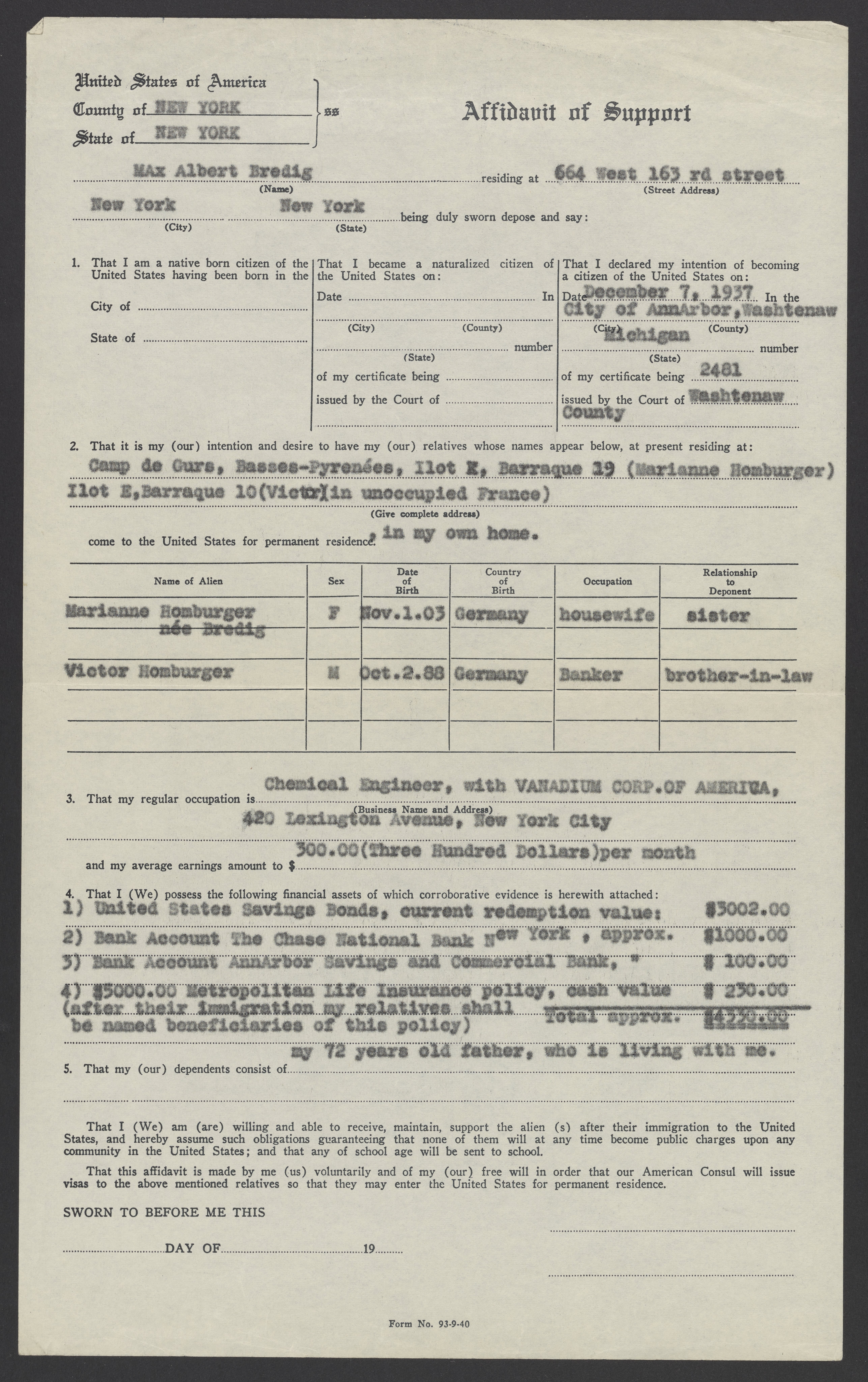 Affidavit for Viktor and Marianne Homburger by Max Bredig