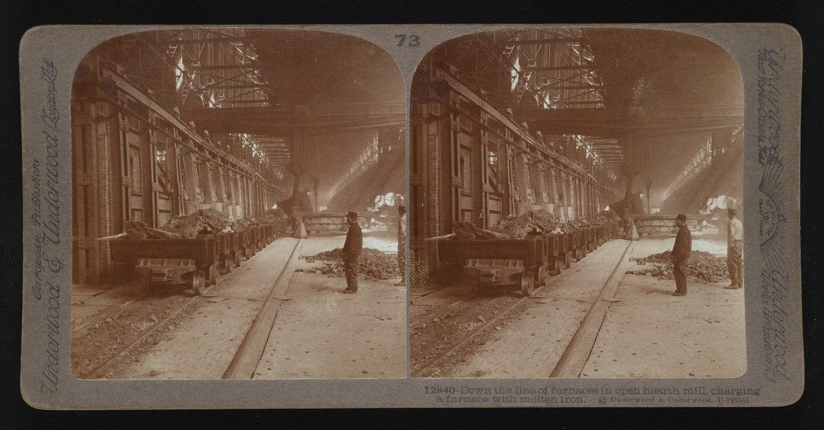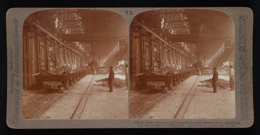 “Down the Line of Furnaces in Open Hearth Mill, Charging a Furnace with Molten Iron.” Underwood & Underwood, n.d. Underwood & Underwood Stereographs of Manufacturing Industries. Science History Institute. Philadelphia. https://digital.sciencehistory.org/works/3b5918567.