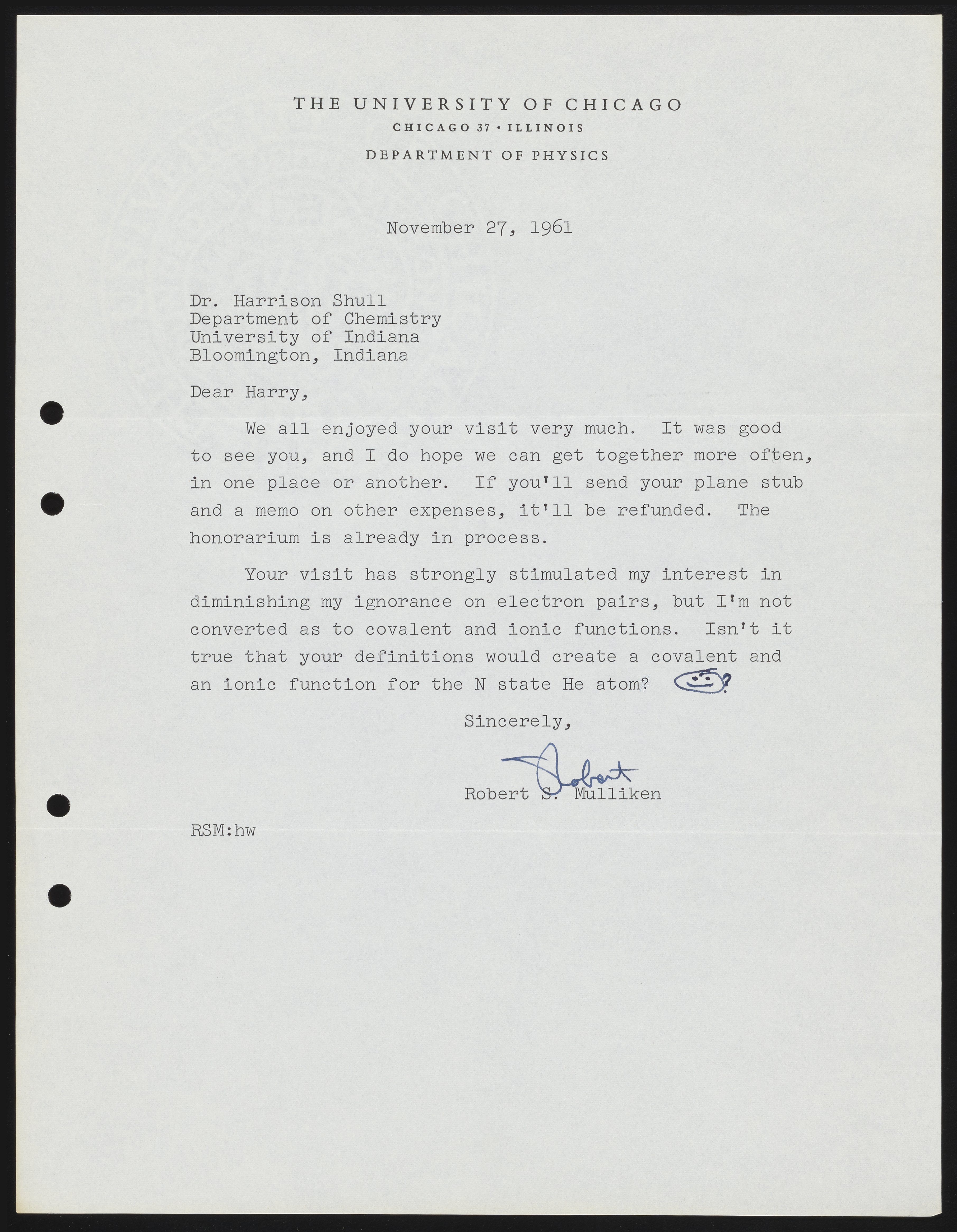 Mulliken, Robert Sanderson. “Letter from Robert S. Mulliken to Harrison Shull, 1961,” November 27, 1961. Robert S. Mulliken & Harrison Shull Correspondence, Box 1. Science History Institute. Philadelphia. https://digital.sciencehistory.org/works/3b591867r.