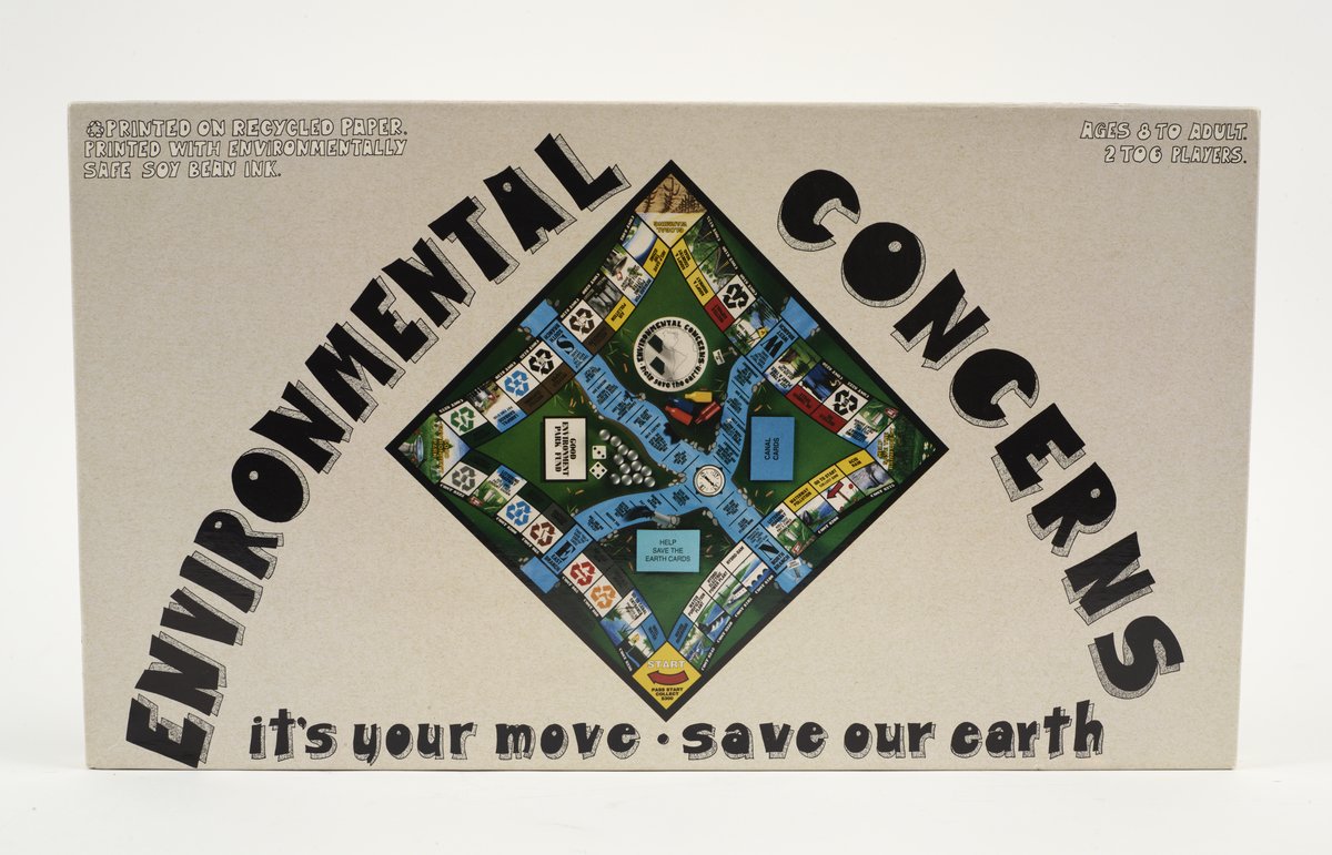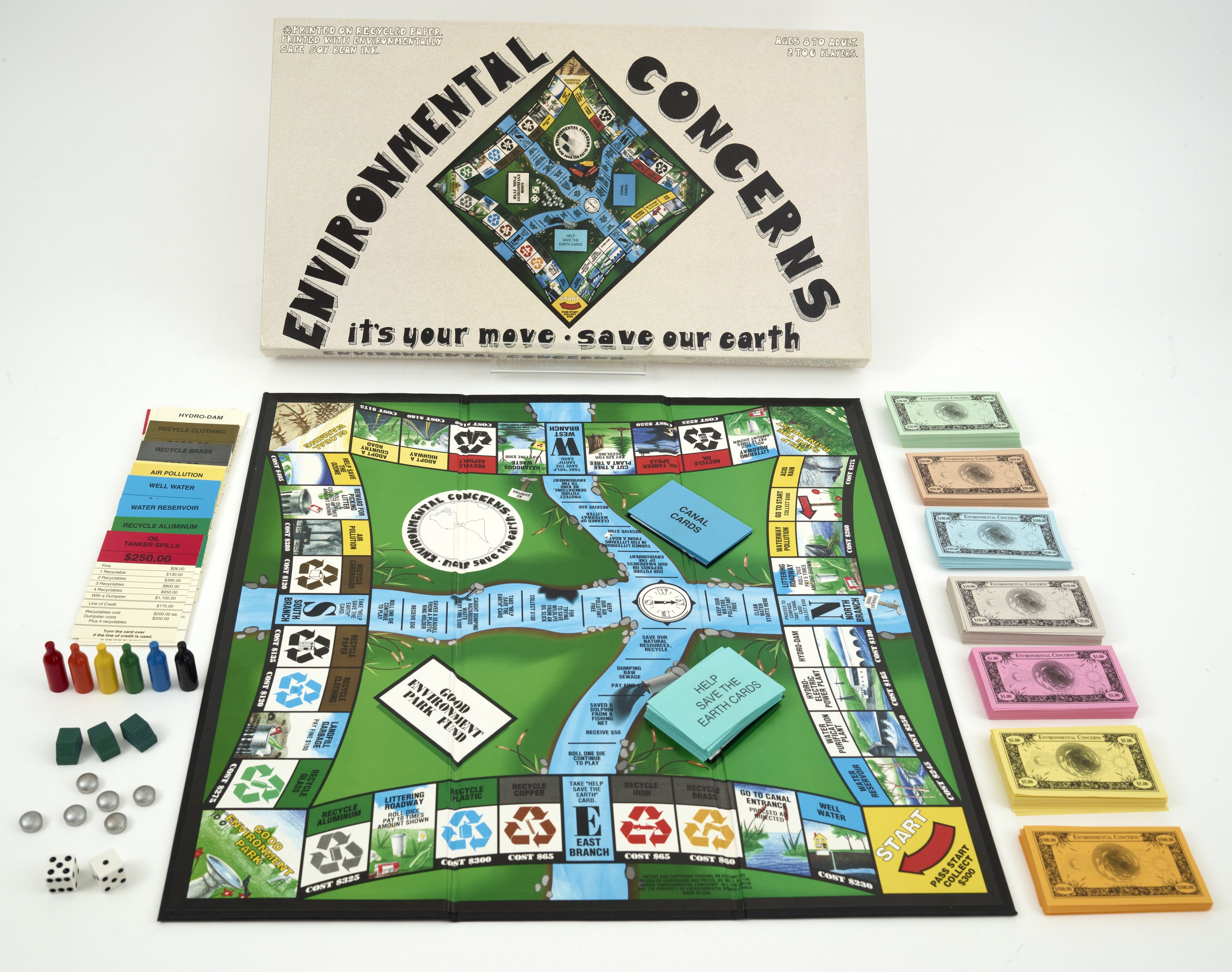 Small JPG1200 x 946px — 219 KBLarge JPG2880 x 2271px — 905 KBFull-sized JPG8966 x 7071px — 5.9 MBOriginal fileTIFF — 8966 x 7071px — 181 MBA rectangular beige game box with black text and an image of the game board printed on the cover. The box contains instructions, 30 "Help Save the Earth" cards, 8 "Canal Trip" cards, 6 wood player pieces, 60 silver wood "Recyclables", 20 green wood "Dumpsters", 2 plastic dice, 23 Environmental Block cards, and paper play money with organizer.