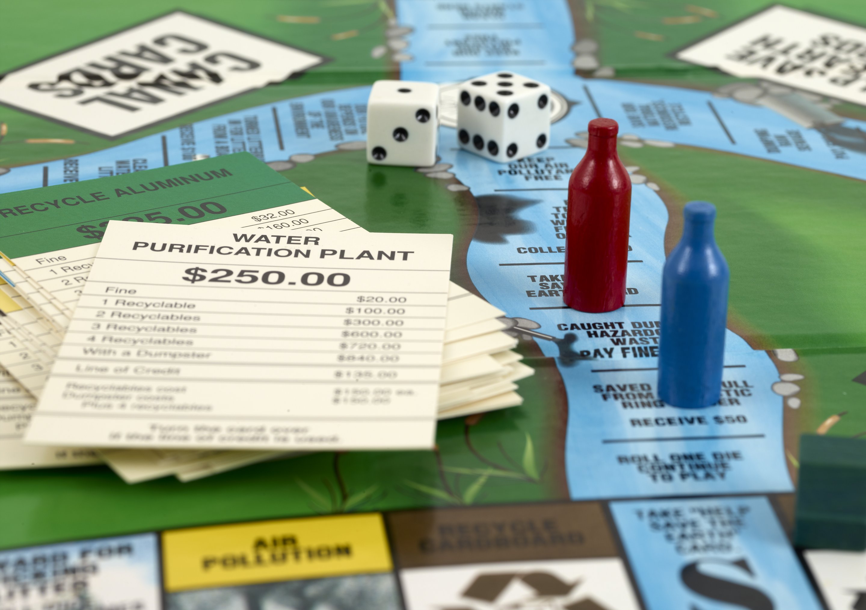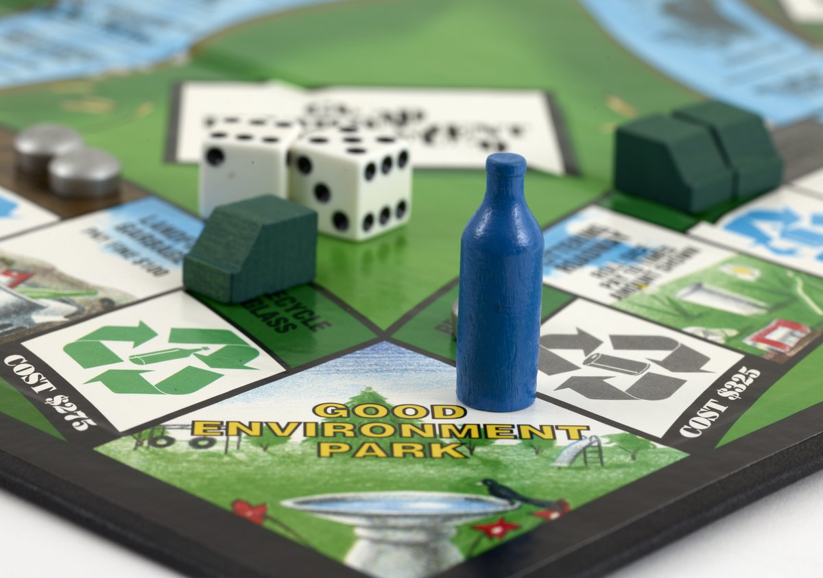 This game is a variant of Monopoly, with more properties arranged according to environmental themes rather than by cost. Instead of railroads, there are two canal entrances that lead to an additional subset of spaces, there are no "utilities," and a "Good Park Fund" rather than "Free Parking."