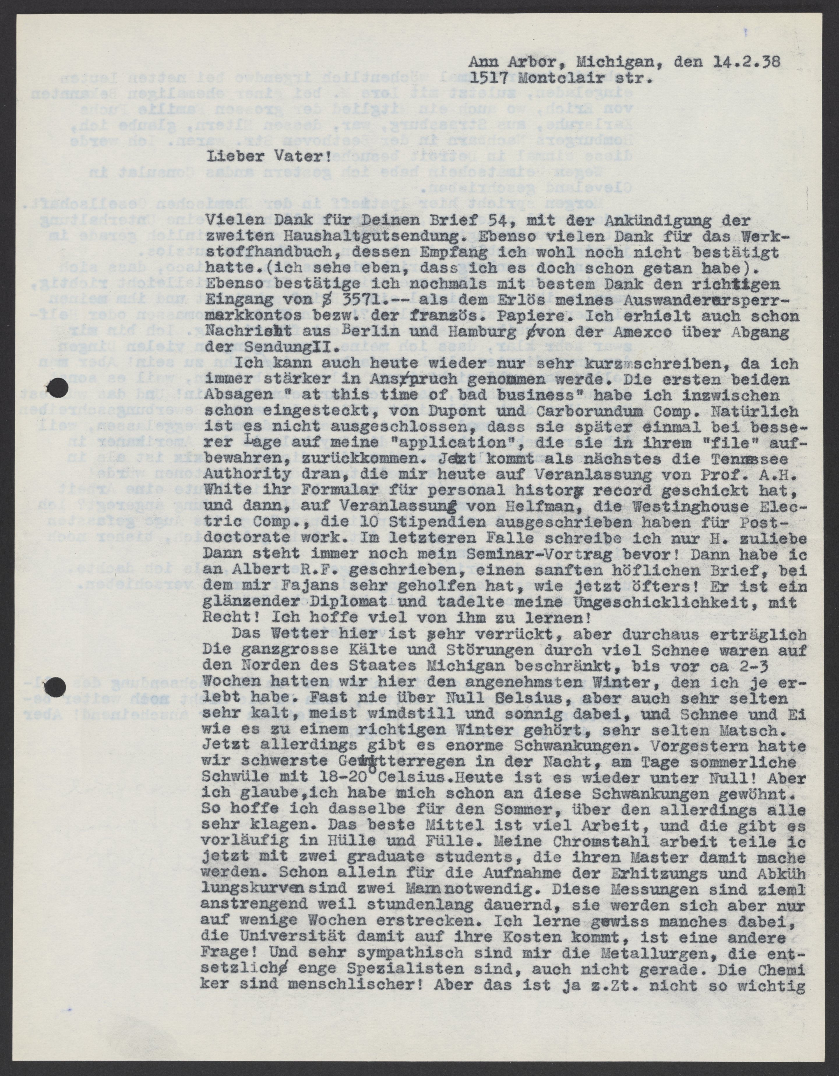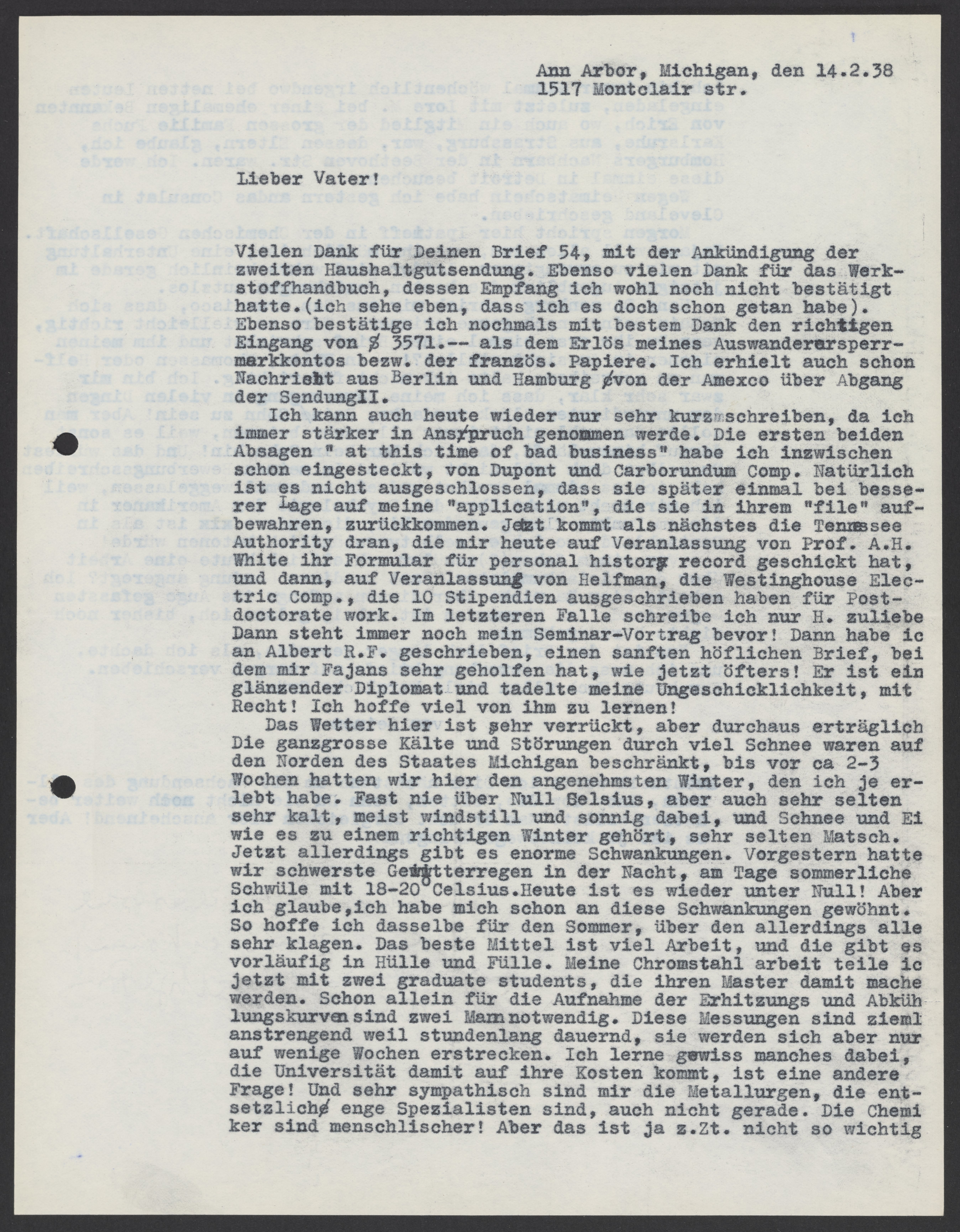 Das Wetter hier ist sehr verrückt, aber durchaus erträglich. Die ganz grosse Kälte und Störungen durch viel Schnee waren auf den Norden des Staates Michigan beschränkt, bis vor ca 2-3 Wochen hatten wir hier den angenehmsten Winter, den ich je erlebt habe. Fast nie über Null Celsius, aber auch sehr selten sehr kalt, meist windstill und sonnig dabei, und Schnee und Eis wie es zu einem richtigen Winter gehört, sehr selten Matsch. Jetzt allerdings gibt es enorme Schwankungen . Vorgestern hatte wir schwerste Gewitterregen in der Nacht, am Tage sommerliche Schwülle mit 18-20° Celsius. Heute ist es wieder unter Null ! Aber ich glaube, ich habe mich schon an diese Schwankungen gewöhnt. So hoffe ich dasselbe für den Sommer, über den allerdings alle sehr klagen. Das beste Mittel ist viel Arbeit, und die gibt es vorläufig in Hülle und Fülle. Meine Chromstahlarbeit teile ich jetzt mit zwei graduate students, die ihren Master damit mache werden . Schon allein für die Aufnahme der Erhitzungs und Abkühlungskurven sind zwei Mann notwendig . Diese Messungen sind ziemlich anstrengend weil stundenlang dauernd, sie werden sich aber nur auf wenige Wochen erstrecken. Ich lerne gewiss manches dabei, die Universität damit auf ihre Kosten kommt, ist eine andere Frage! Und sehr sympathisch sind mir die Metallurgen, die entsetzliche enge Spezialisten sind, auch nicht gerade. Die Chemiker sind menschlicher! Aber das ist ja z.Zt. nicht so wichtig.