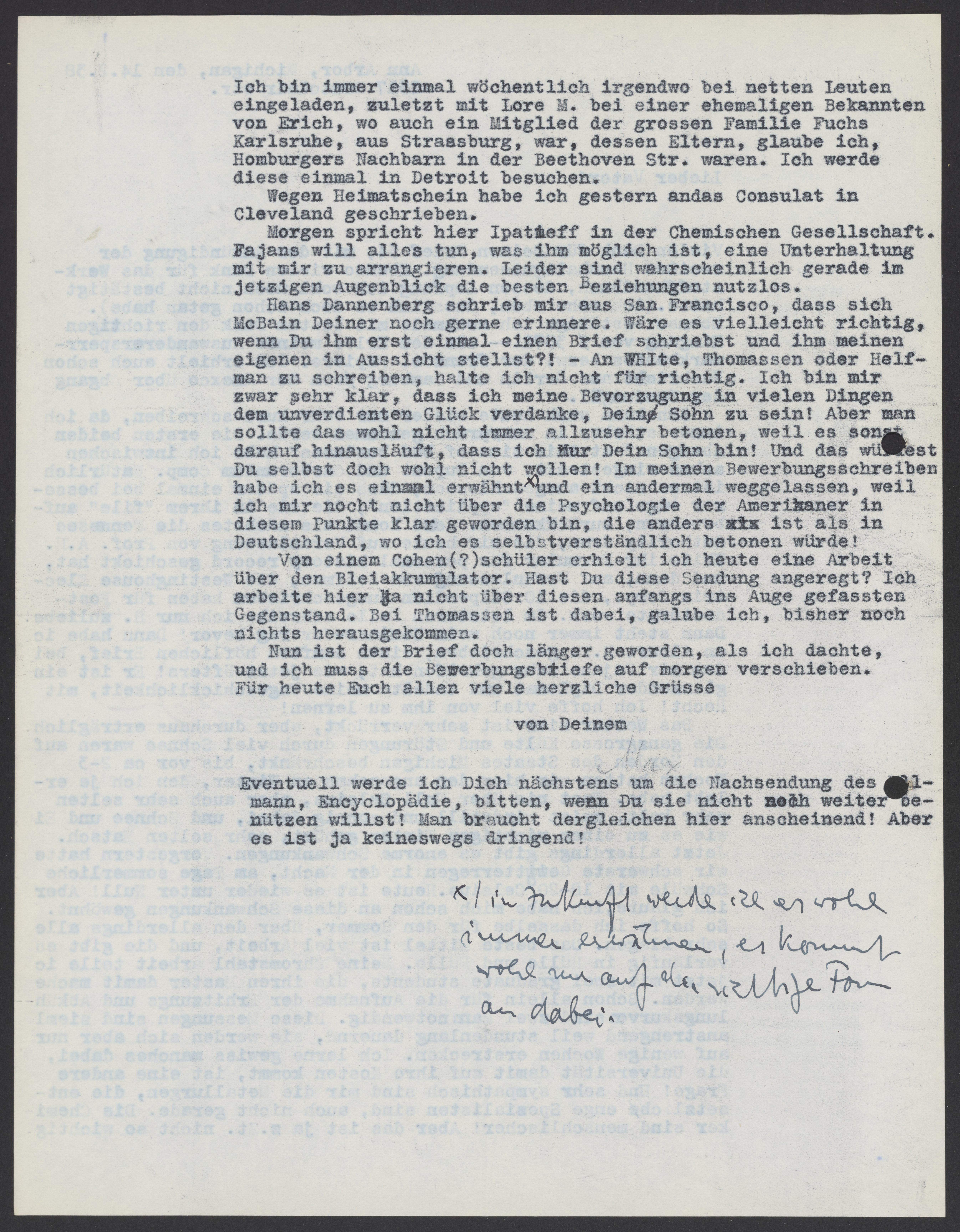 Tomorrow, Ipatieff is speaking here at the Chemical Society. Fajans wants to do everything he can to arrange a conversation between me and Ipatieff. Unfortunately, the best relationships are probably useless right now. Hans Dannenberg wrote to me from San Francisco that McBain remembers you fondly. Would it perhaps be proper for you to write him a letter first, and then I could write him my own? I don’t think it’s suitable to write to White, Thomassen or Helfmann. I understand very clearly that I owe my favoritism in many affairs to the privilege of being your son! However, I shouldn’t always emphasize that too much, because otherwise it comes down to the fact that I’m just your son! Moreover, you wouldn’t personally want that! I mentioned it once in my letters of application and then left it out at other times because I still haven't figured out the psychology of Americans in this respect, which is different than in Germany, where I would of course emphasize it!
