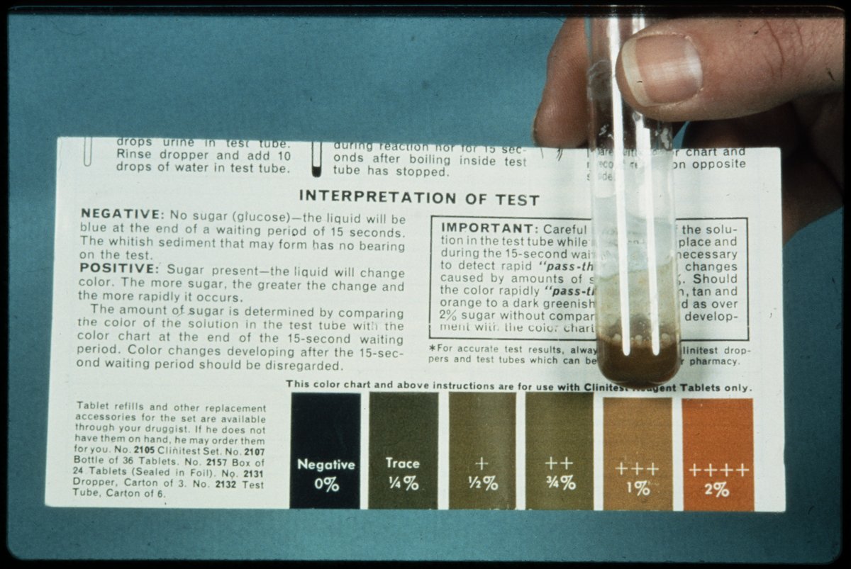“Test for Urine Sugar Using Clinitest Reagent Tablets ,” 1970–1979. Photographs from the Dr. Michael Somogyi Collection, Box 2. Science History Institute. Philadelphia. https://digital.sciencehistory.org/works/3dz5cja.
