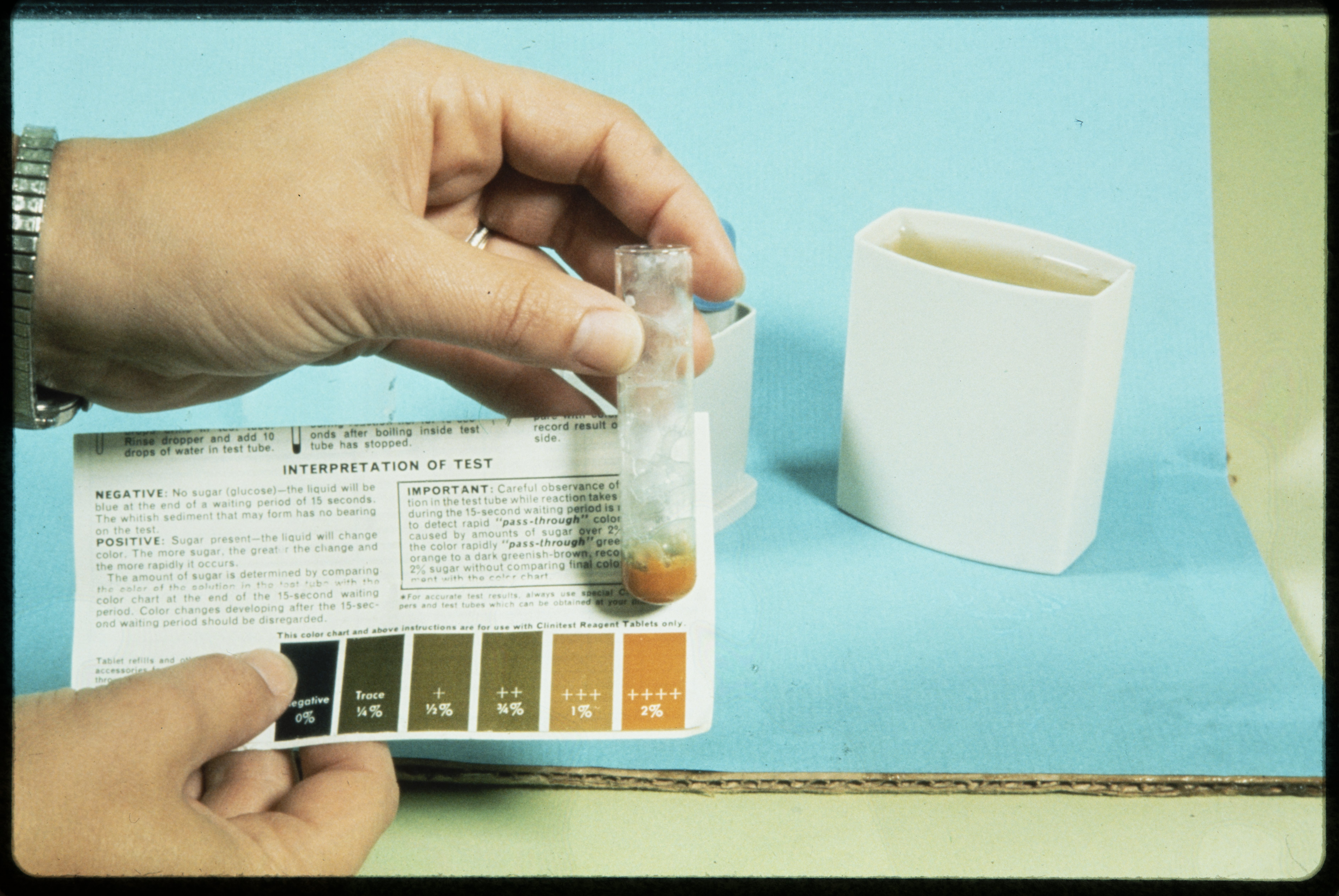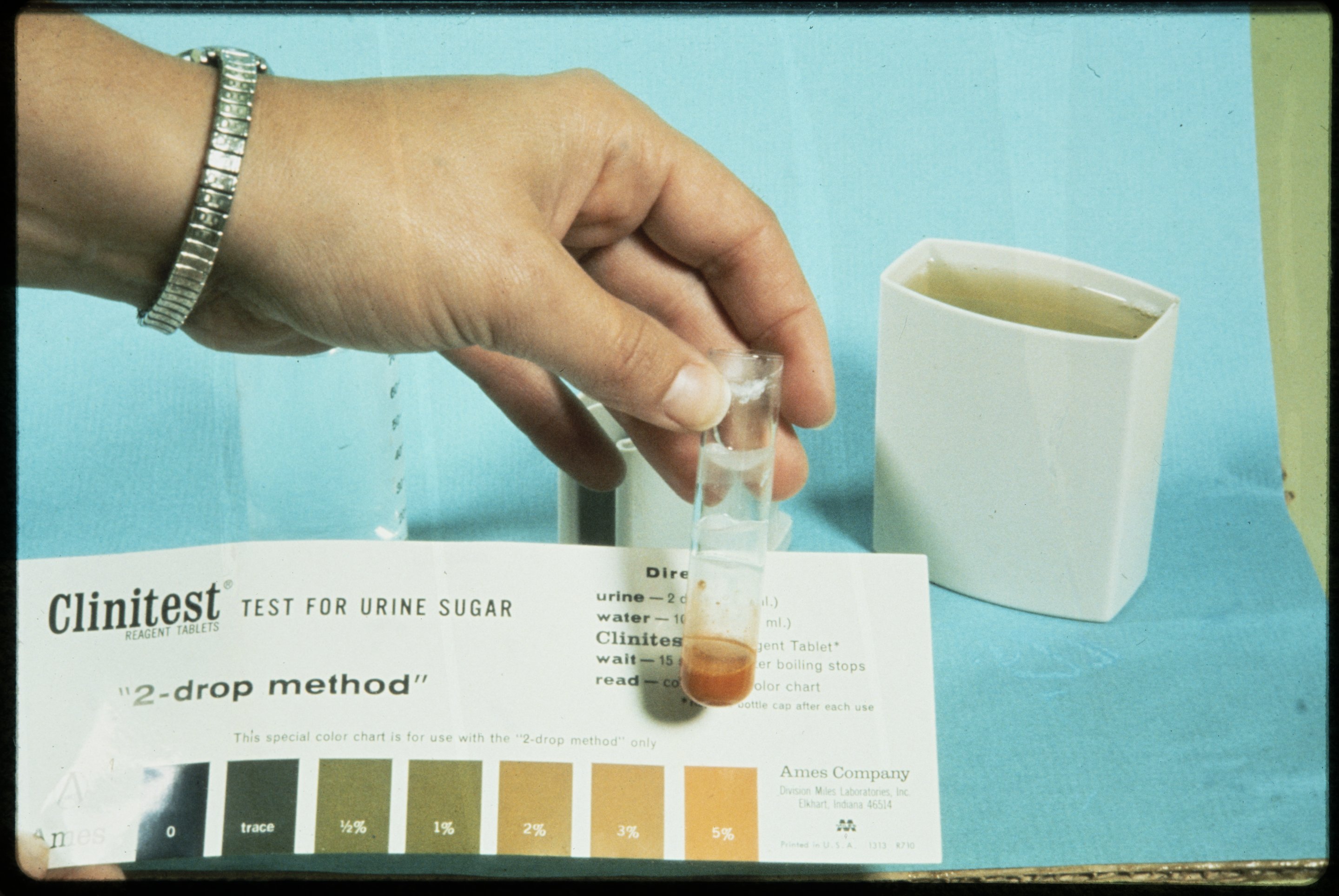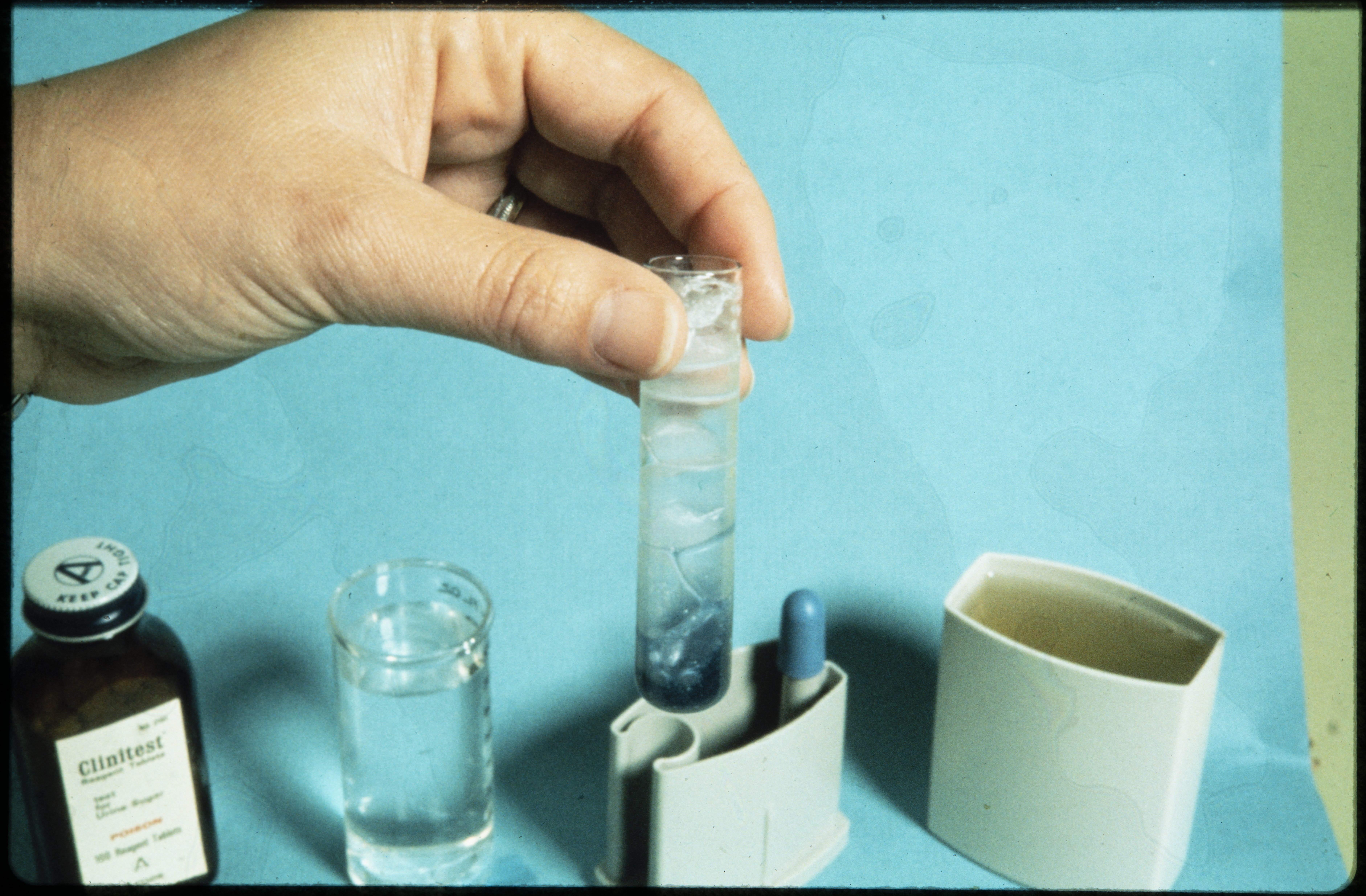 “Test for Urine Sugar Using Clinitest Reagent Tablets ,” 1970–1979. Photographs from the Dr. Michael Somogyi Collection, Box 2. Science History Institute. Philadelphia. https://digital.sciencehistory.org/works/3dz5cja.