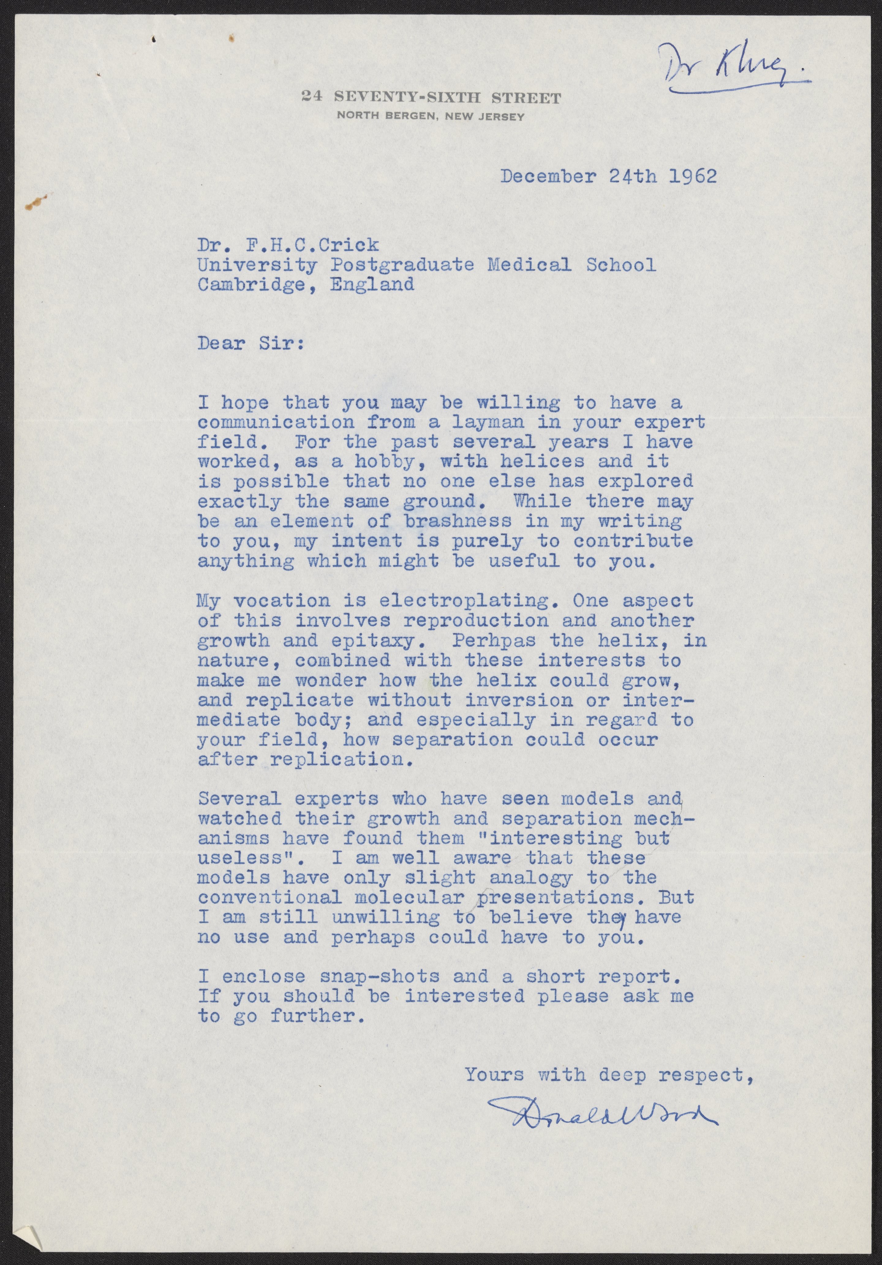 Letter to Francis Crick, December 24, 1962
