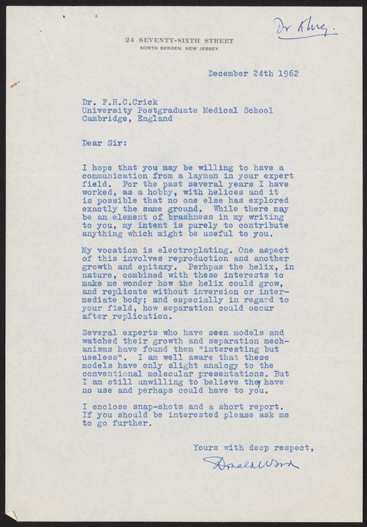 “Letter to Francis Crick, December 24, 1962,” December 24, 1962. History of Molecular Biology Collection, Box 20, Folder 8. Science History Institute. Philadelphia. https://digital.sciencehistory.org/works/3eildy3.