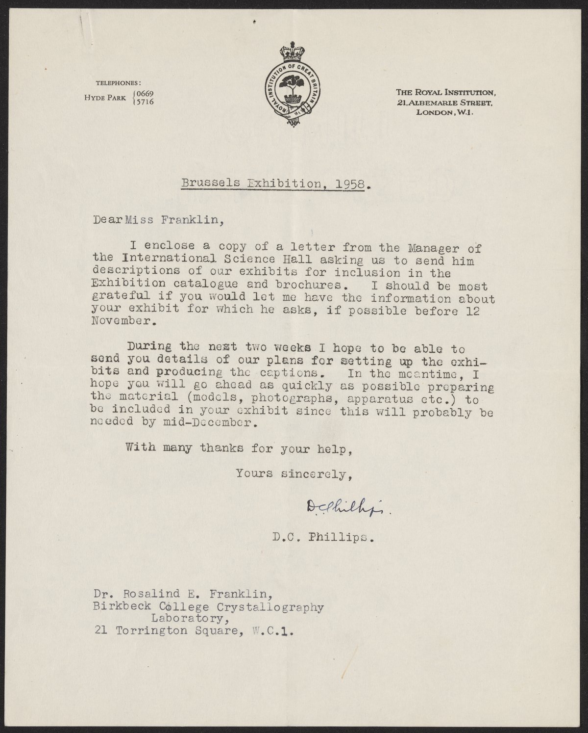 Letter from D. C. Phillips to Rosalind Franklin, October, 1957