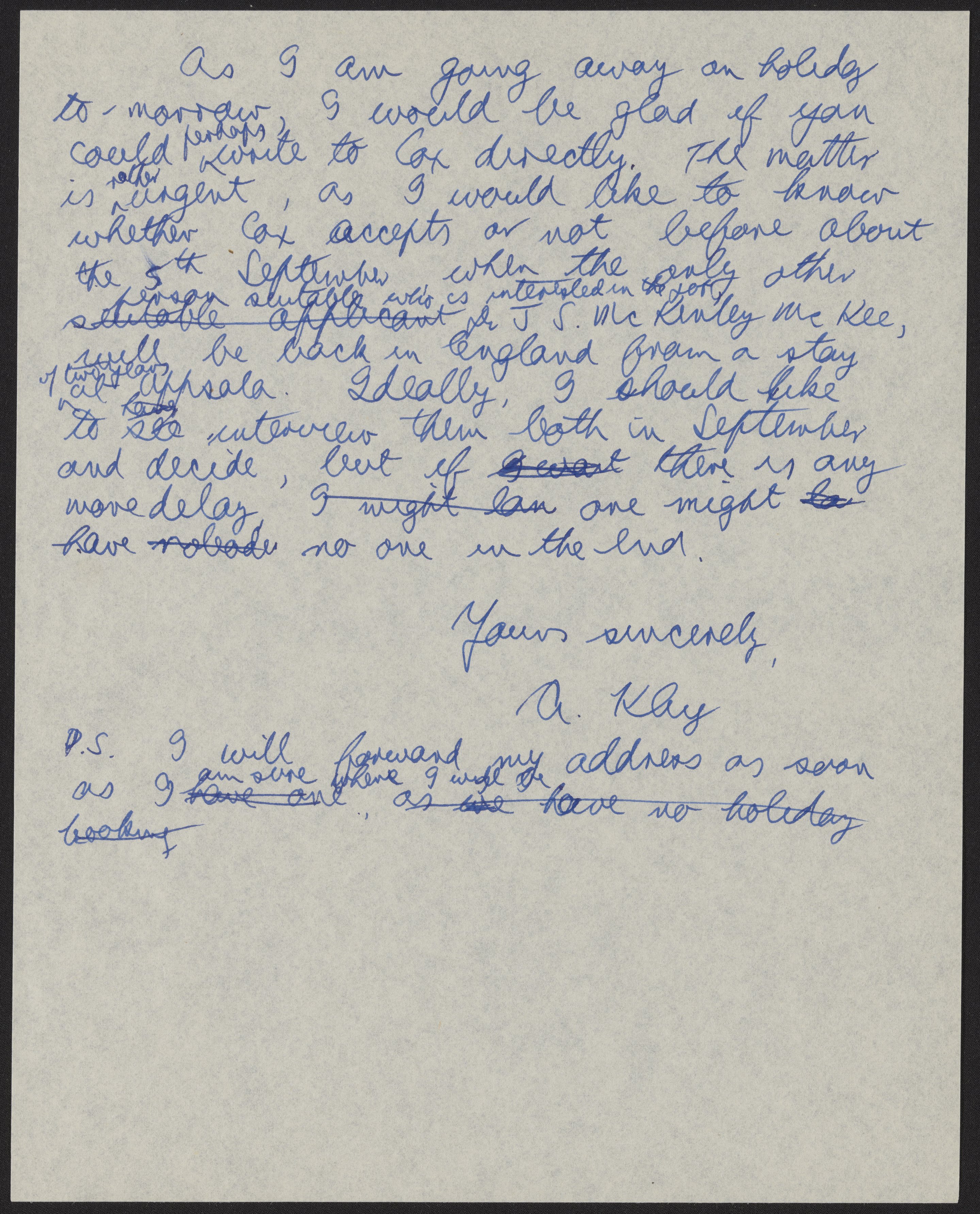 Letter from Aaron Klug to A. J. Caraffi, August 19, 1959