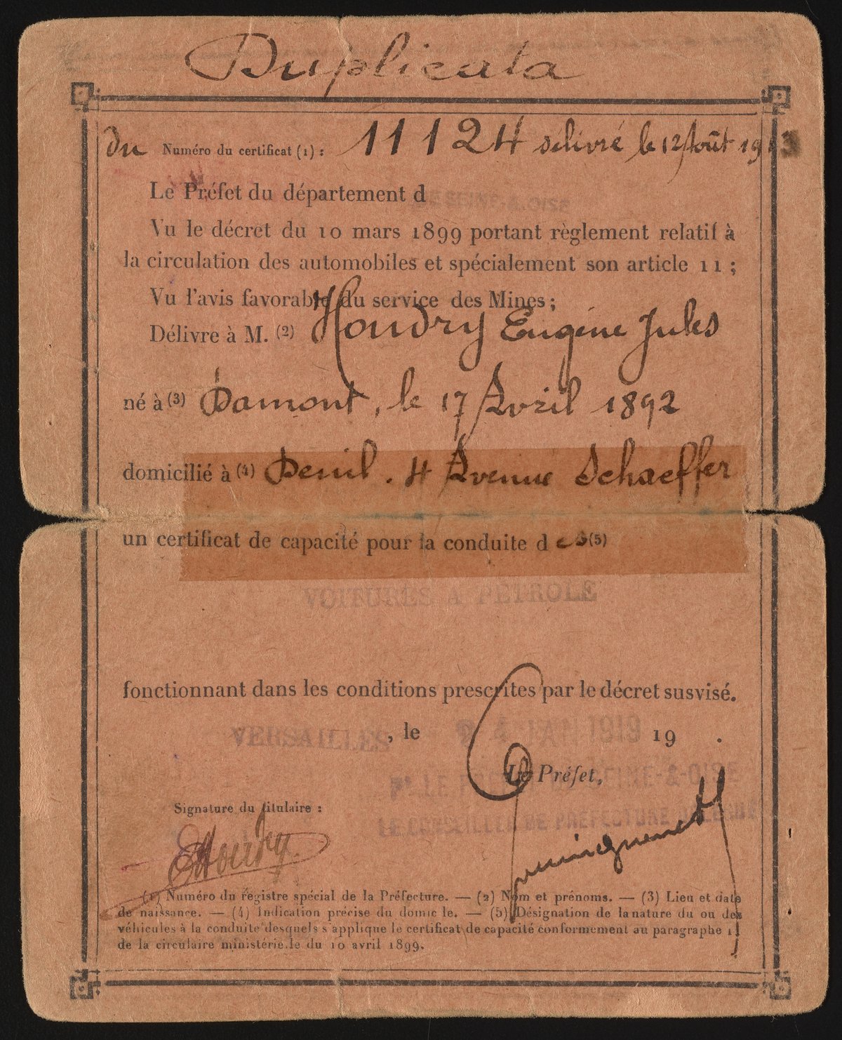 “Eugene Houdry Driver's License,” 1919. Eugene Jules Houdry Collection, Box 1. Science History Institute. Philadelphia. https://digital.sciencehistory.org/works/3j333269s.