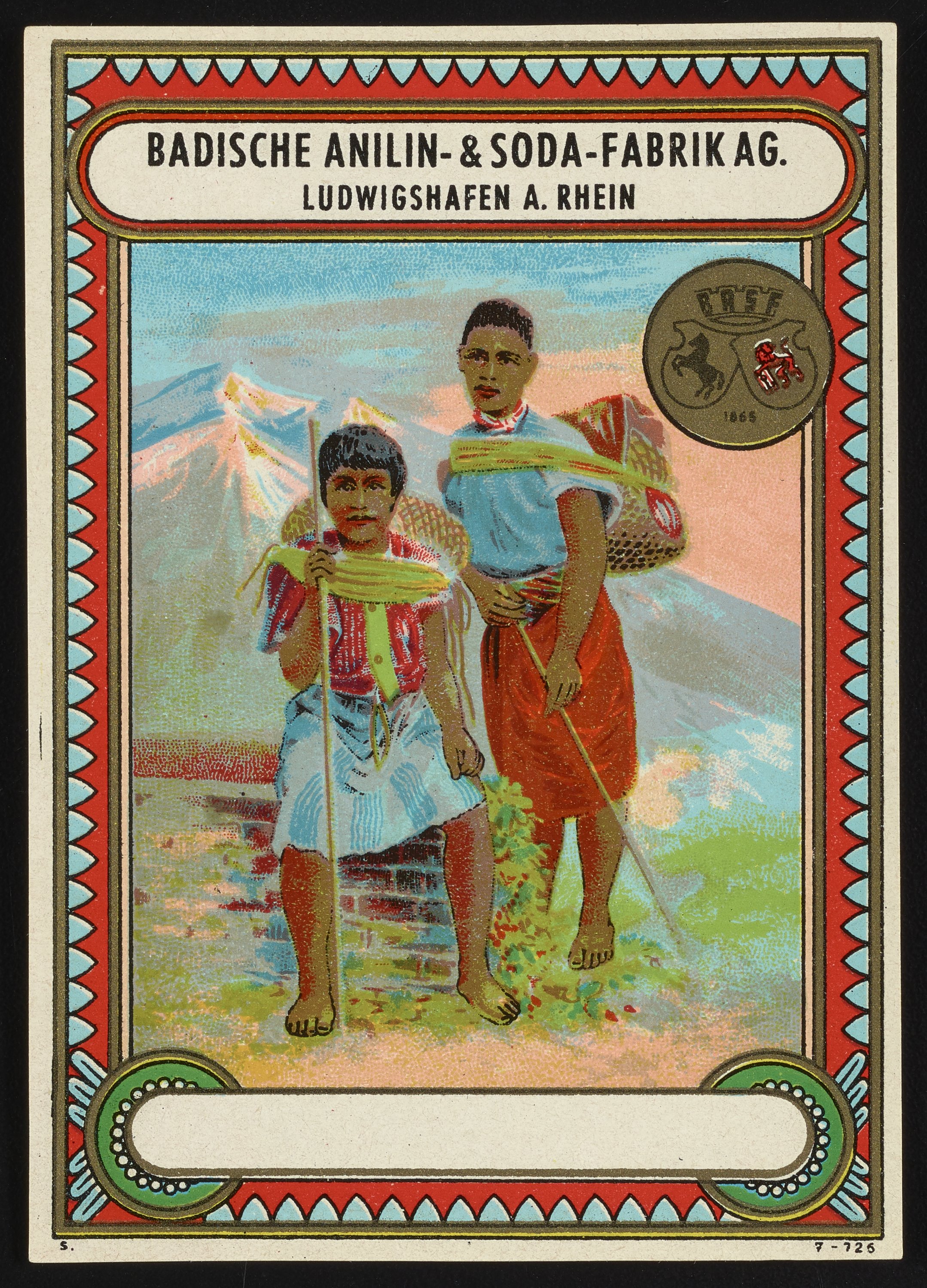 “Badische Anilin & Soda-Fabrik Dye Label with Figures in a Mountainous Landscape.” Dye transfer prints. Ludwigshafen am Rhein, Germany: Badische Anilin- & Soda-Fabrik, circa 1900. Science History Institute. Philadelphia. https://digital.sciencehistory.org/works/3j3333398.