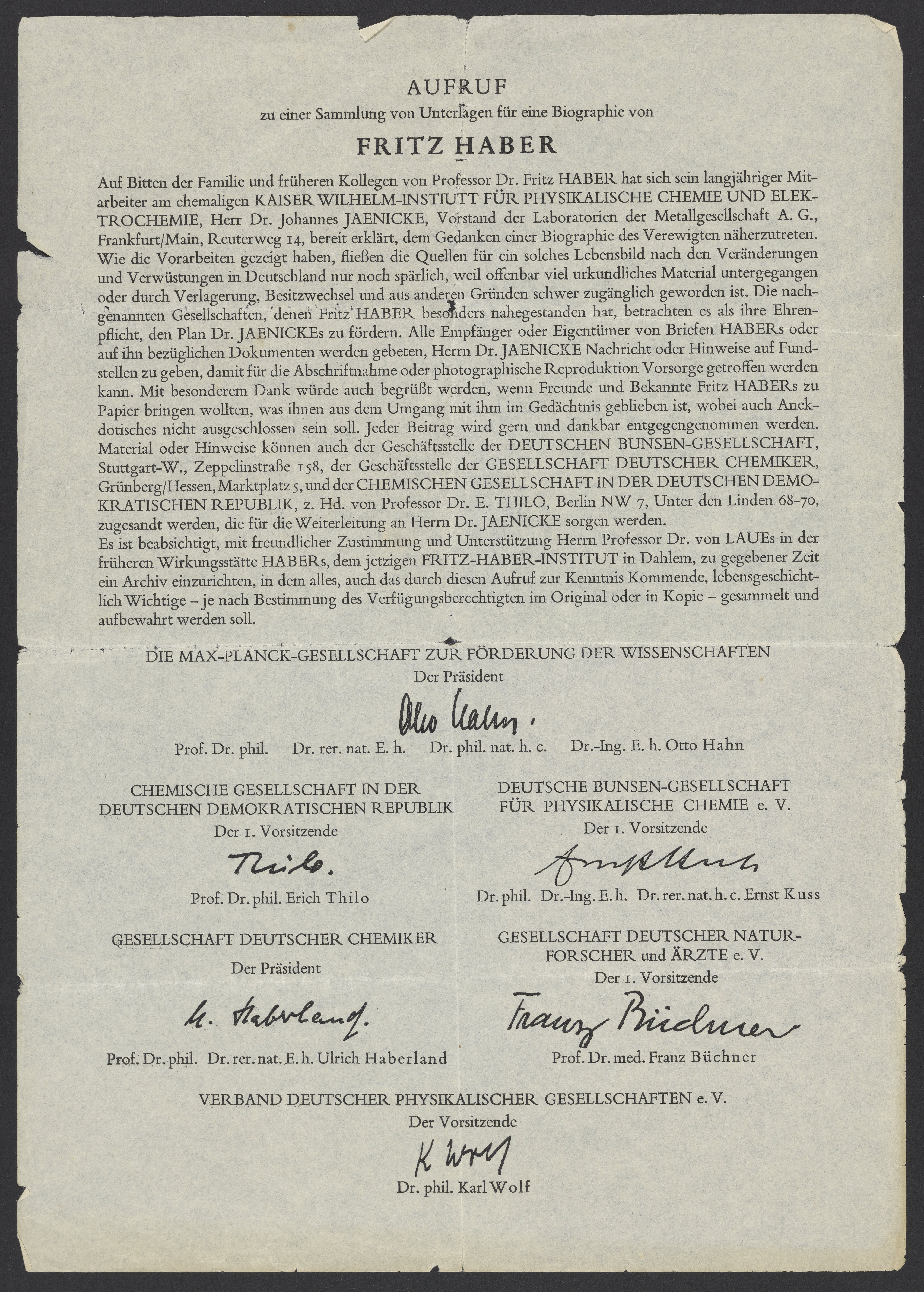 Max-Planck-Gesellschaft zur Förderung der Wissenschaften. “Appeal for a Collection of Documents for a Biography of Fritz Haber,” circa 1957. Papers of Georg and Max Bredig, Box 8, Folder 27. Science History Institute. Philadelphia. https://digital.sciencehistory.org/works/3jnxg6s.