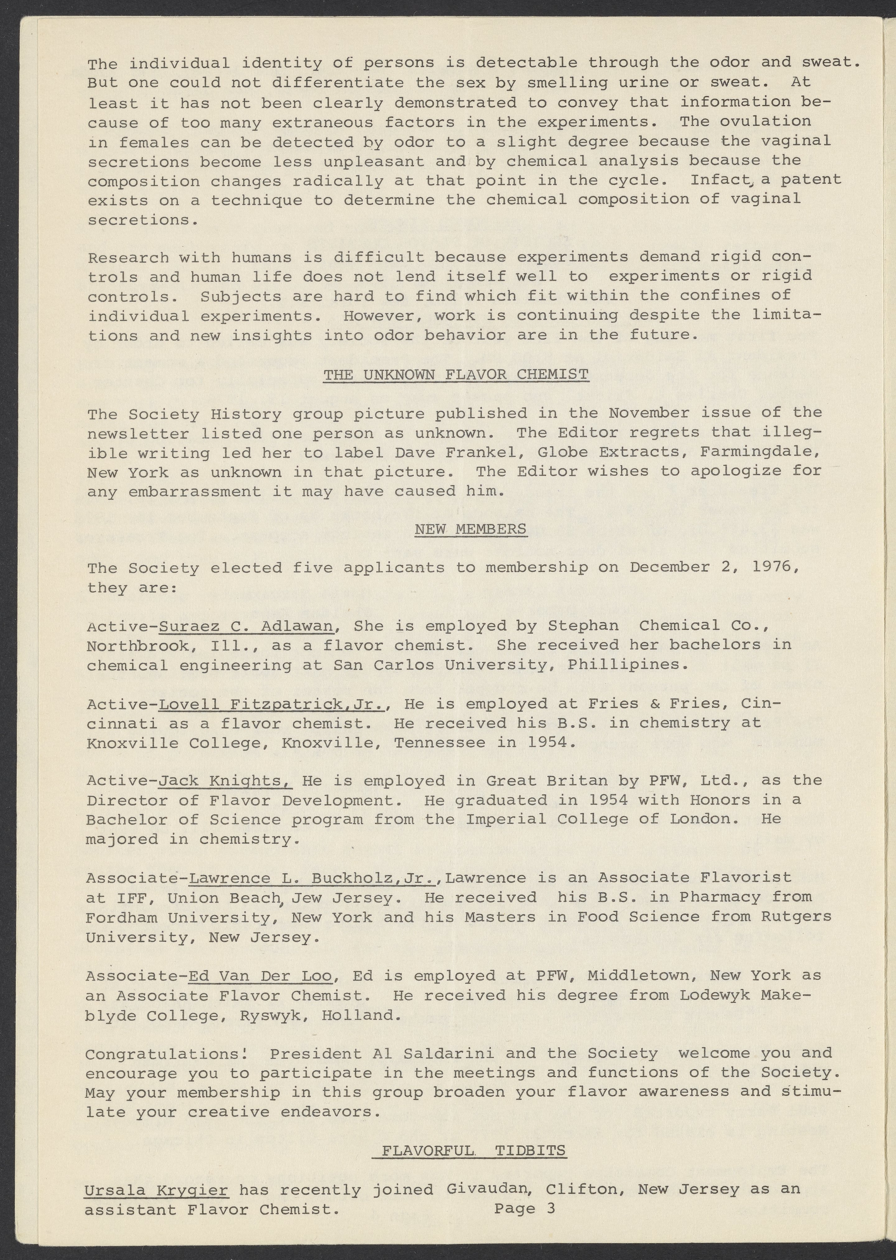 Society of Flavor Chemists. “Society of Flavor Chemists Newsletter, December 1976,” December 1976. Society of Flavor Chemists Newsletters and Certificate of Incorporation, Box 1, Folder 1. Science History Institute. Philadelphia. https://digital.sciencehistory.org/works/3k2x1h1.