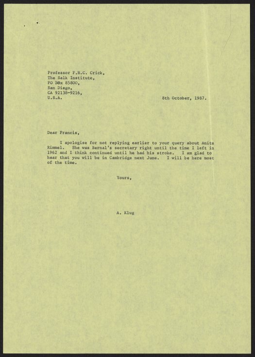 Klug, A. (Aaron), Sir. “Letter from Aaron Klug to Francis Crick, October 8, 1987,” October 8, 1987. History of Molecular Biology Collection, Box 20, Folder 4. Science History Institute. Philadelphia. https://digital.sciencehistory.org/works/3k66i3s.