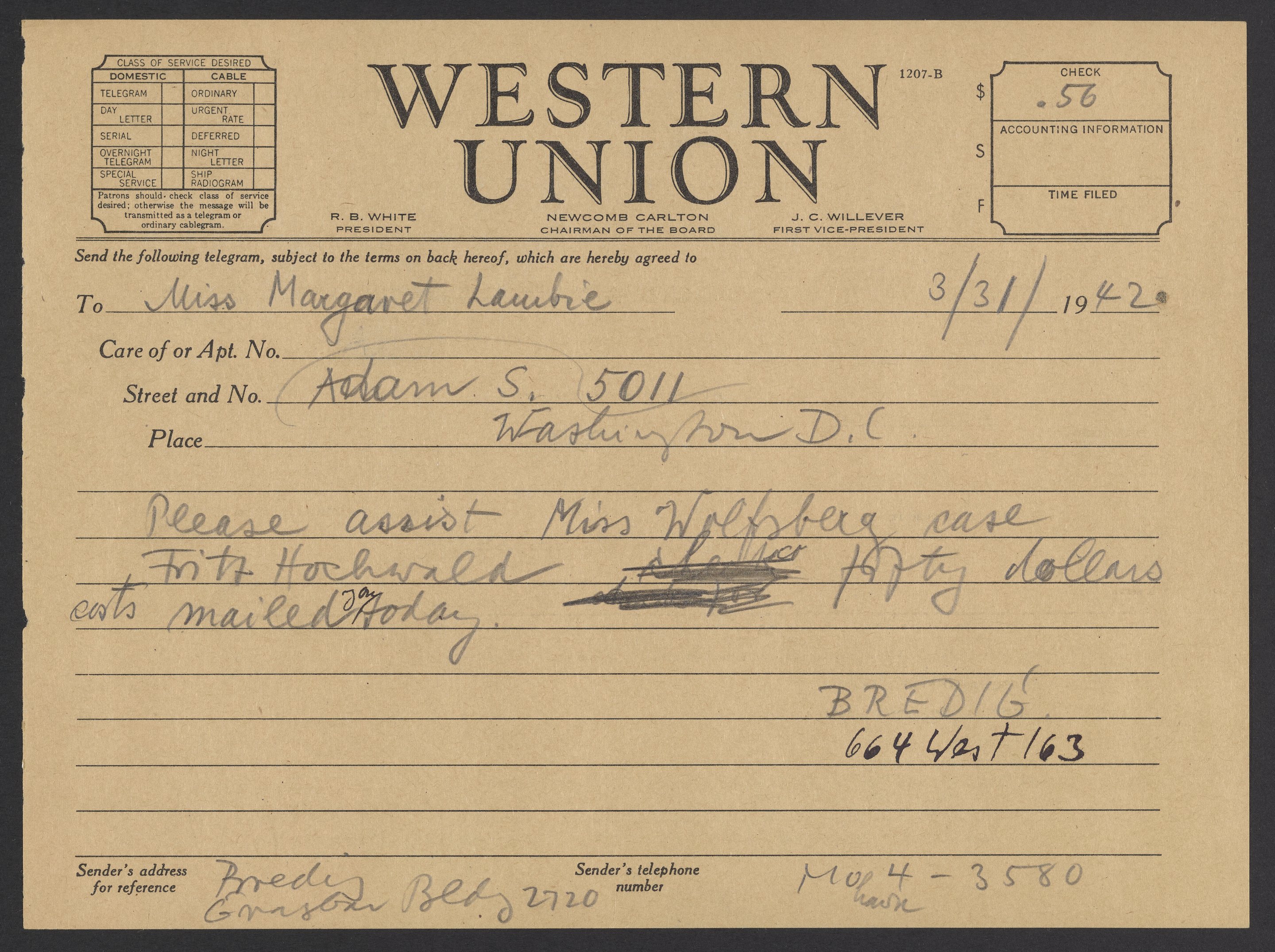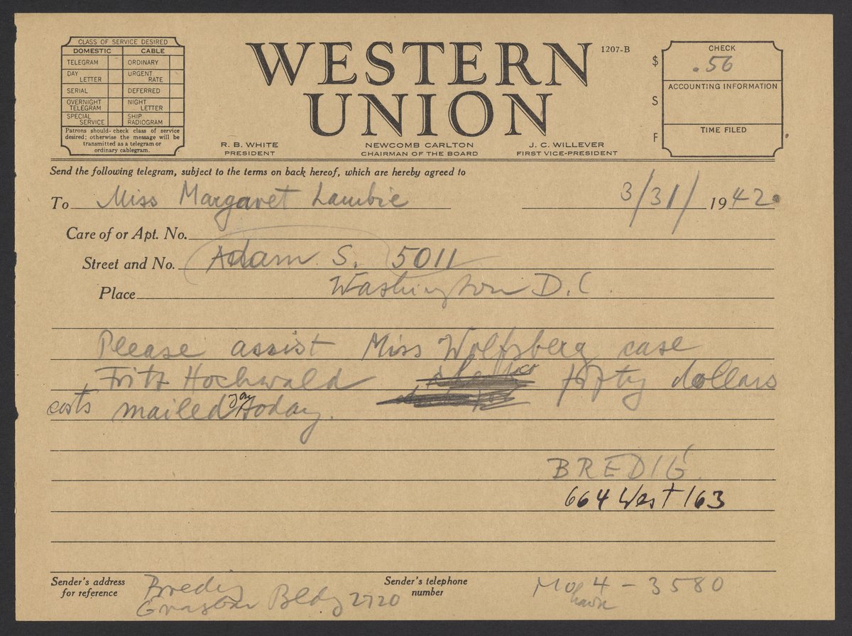 Telegram from Max Bredig to Margaret Lambie, March 31, 1942