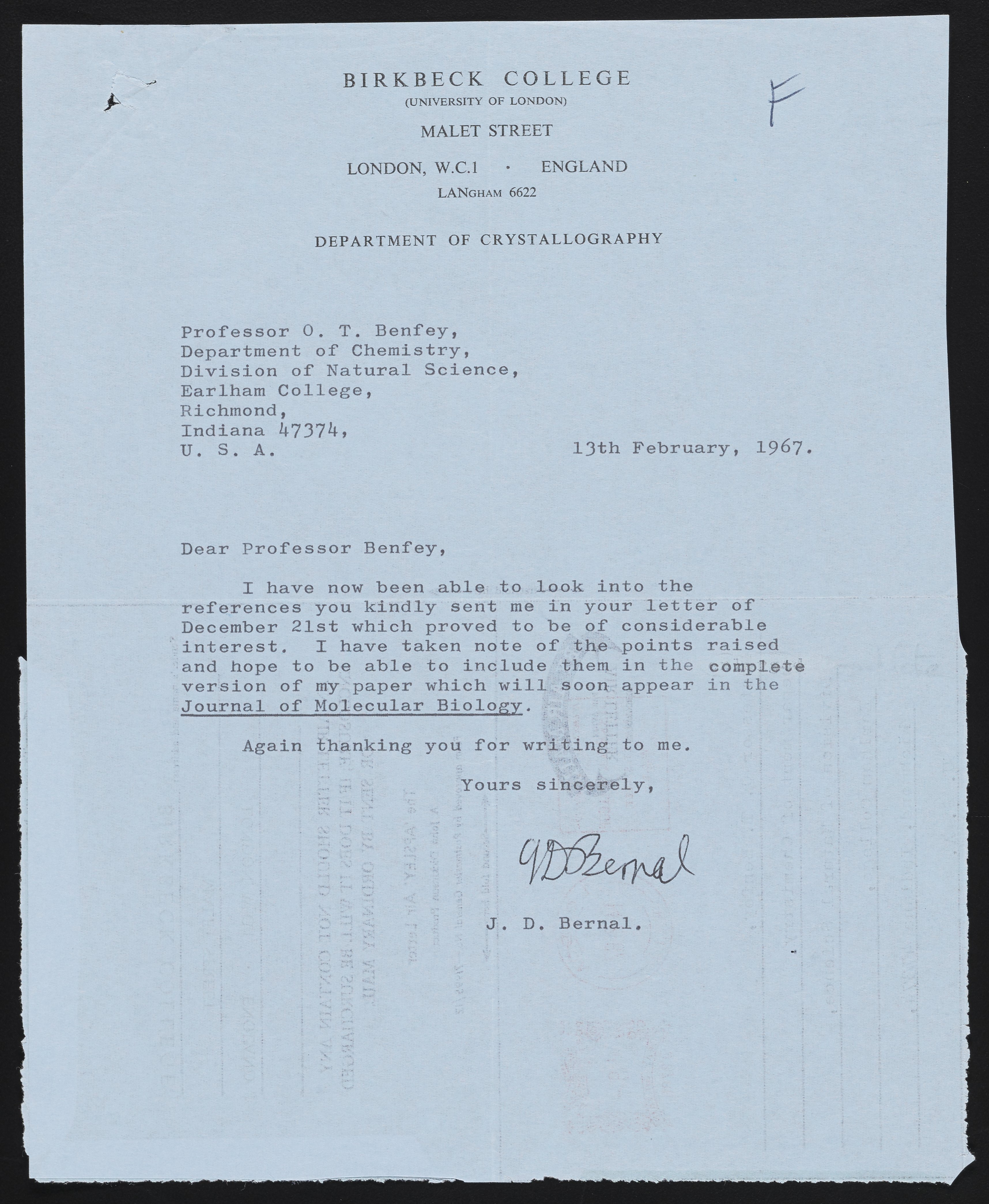 Letter from John D. Bernal to Theodor Benfey