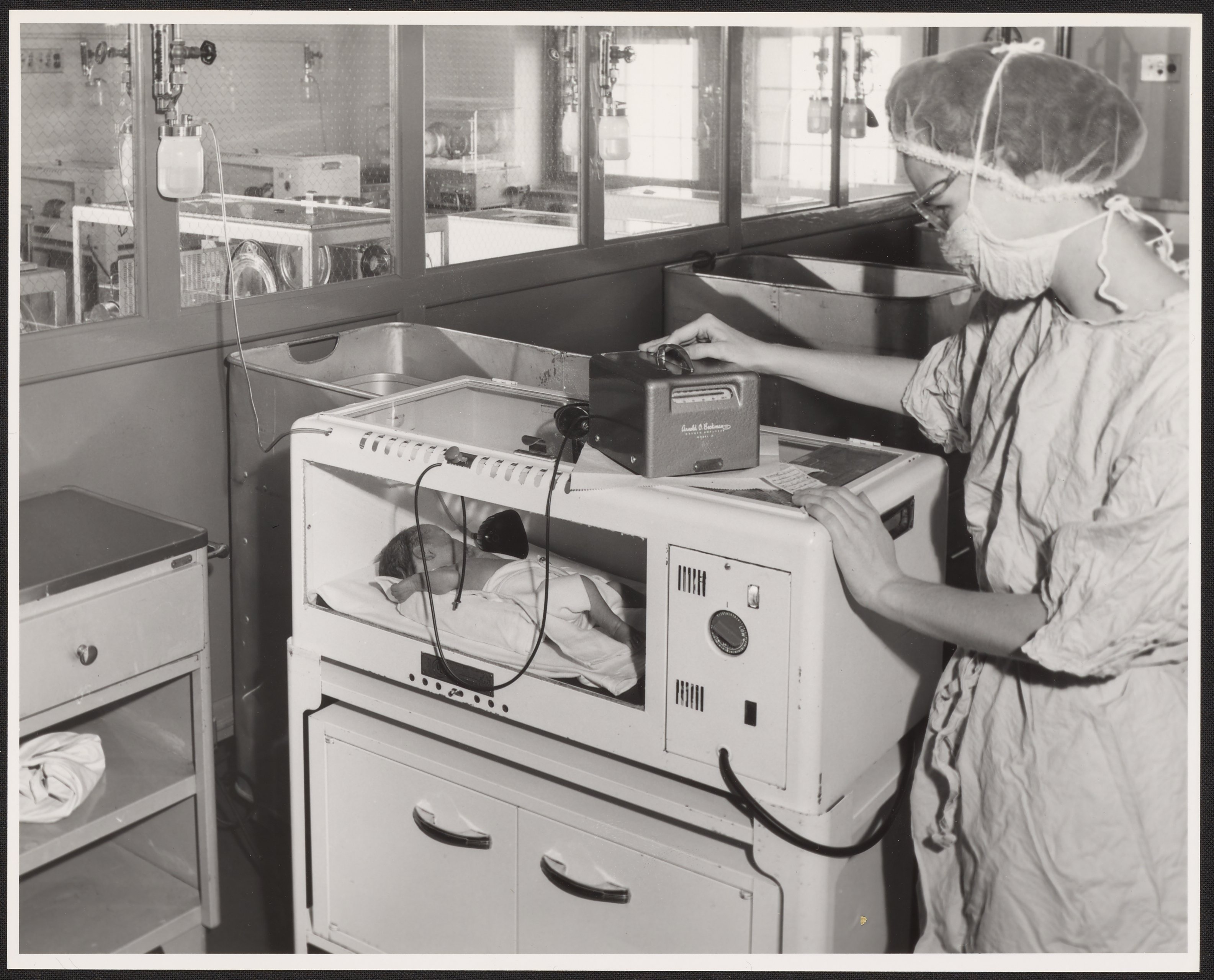 Beckman Model D Oxygen Meter in use with an infant's incubator