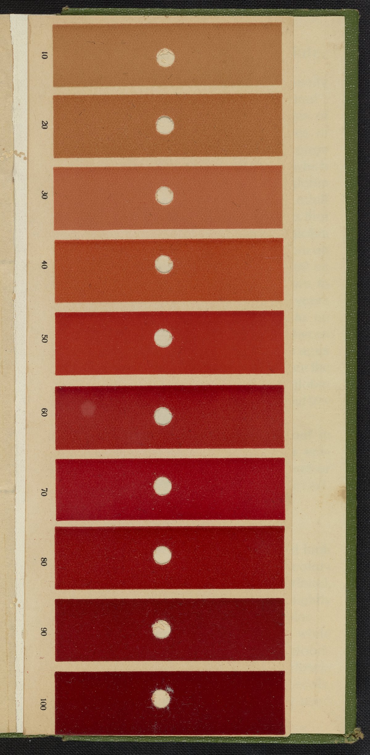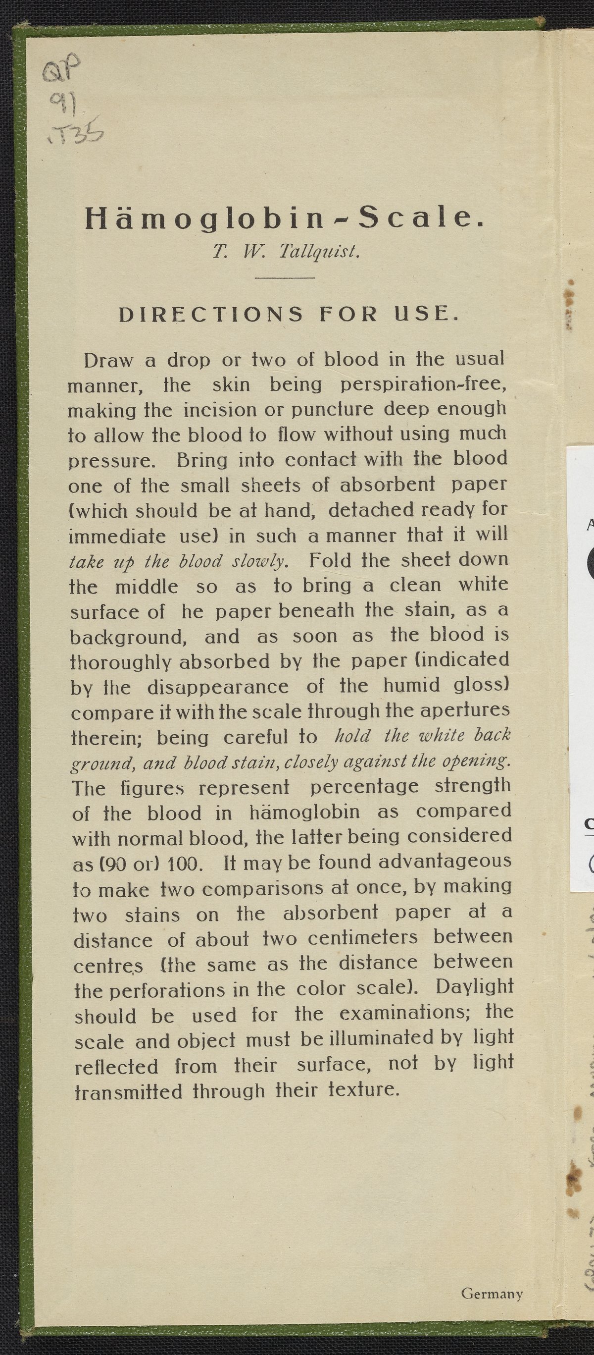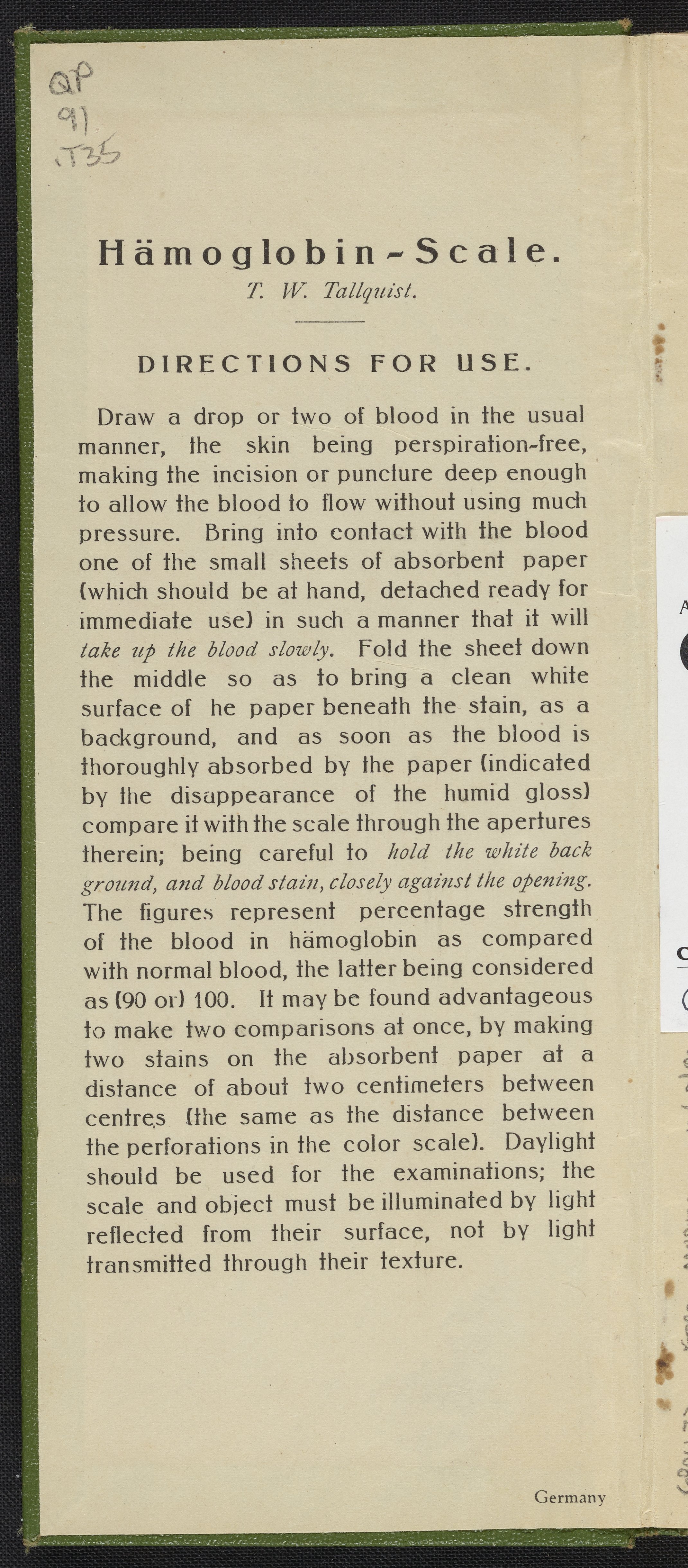 Small JPG1200 x 2639px — 789 KBFull-sized JPG2212 x 4865px — 2.3 MBOriginal fileTIFF — 2212 x 4865px — 30.8 MBDeveloped circa 1900 and often called the Tallquist Method, it is used to compare a patient's blood color to a chart of red colors to diagnose possible anemia. The method is still used when more sophisticated equipment is unavailable. This booklet of absorbent papers and a color scale of reds is undated but appears to be from the early quarter of the 20th century. A health care provider takes a patient's blood sample on the perforated, absorbent paper then holds the sample under the holes in the color chart to decided which color matches best. Hemoglobin is an iron containing protein that bonds with oxygen and is responsible for making blood red.