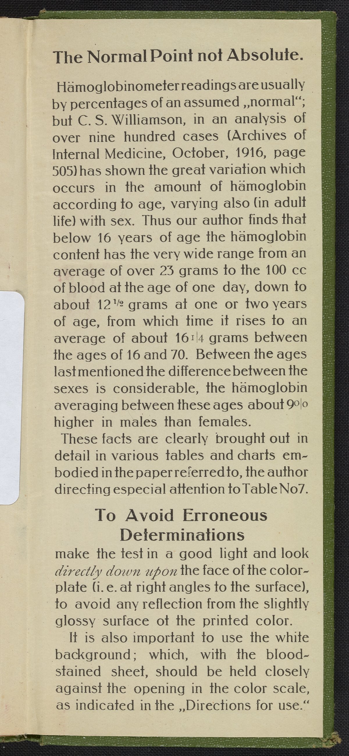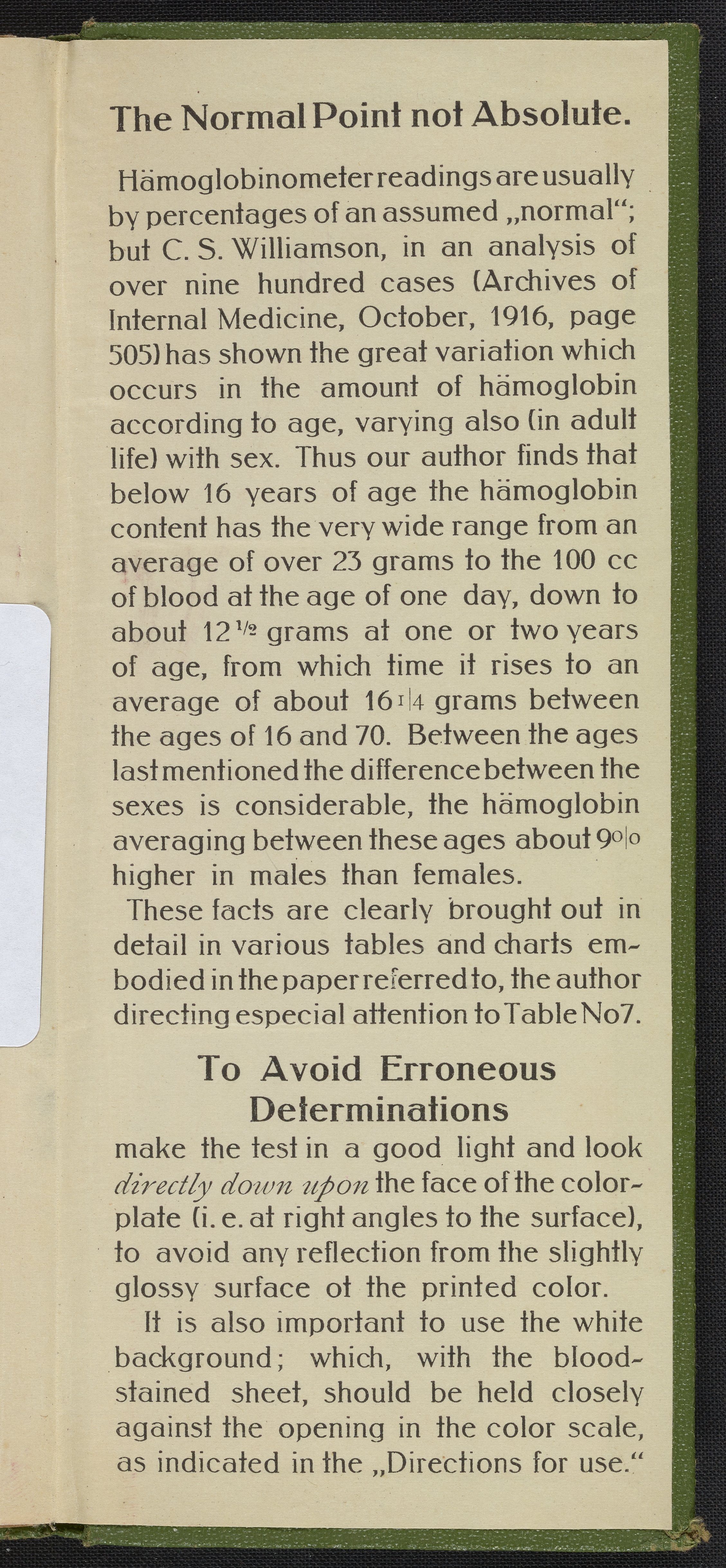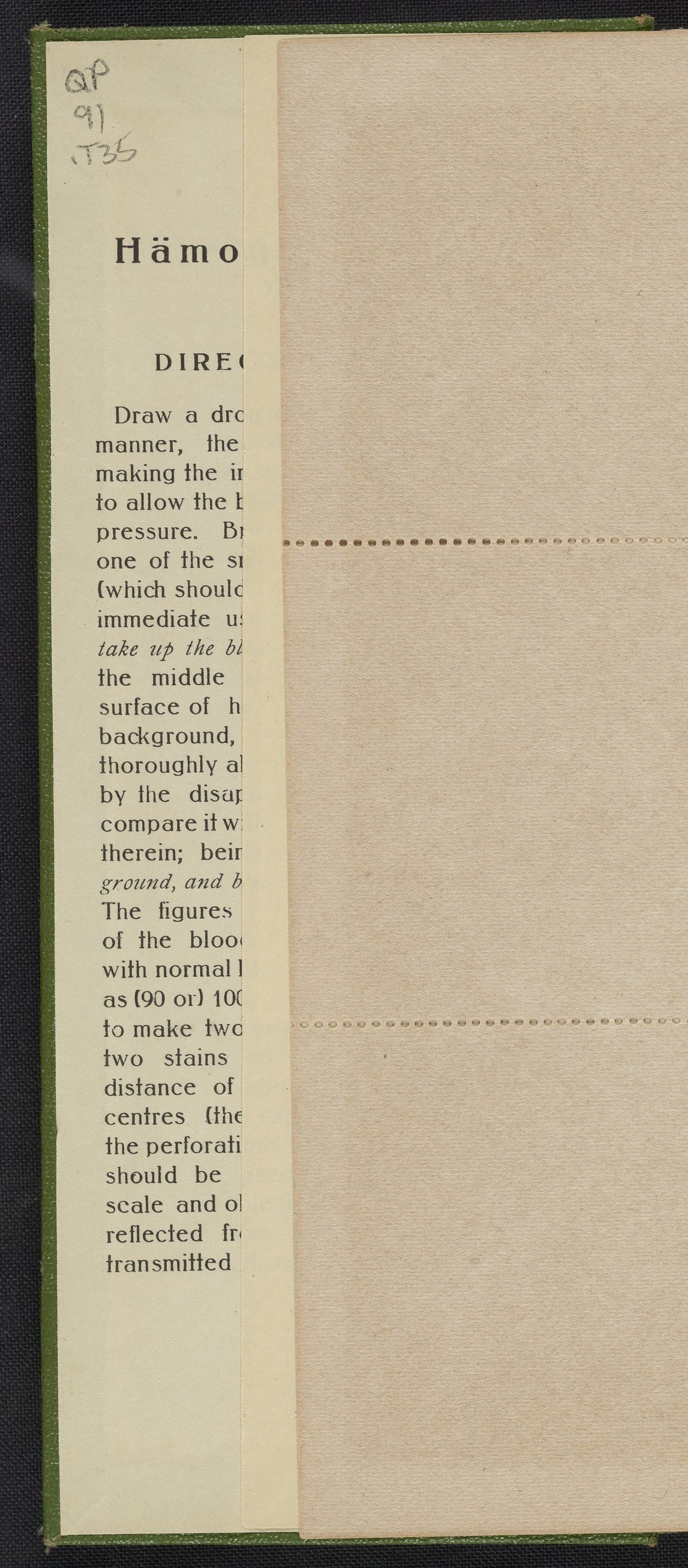 Small JPG1200 x 2639px — 789 KBFull-sized JPG2212 x 4865px — 2.3 MBOriginal fileTIFF — 2212 x 4865px — 30.8 MBDeveloped circa 1900 and often called the Tallquist Method, it is used to compare a patient's blood color to a chart of red colors to diagnose possible anemia. The method is still used when more sophisticated equipment is unavailable. This booklet of absorbent papers and a color scale of reds is undated but appears to be from the early quarter of the 20th century. A health care provider takes a patient's blood sample on the perforated, absorbent paper then holds the sample under the holes in the color chart to decided which color matches best. Hemoglobin is an iron containing protein that bonds with oxygen and is responsible for making blood red.