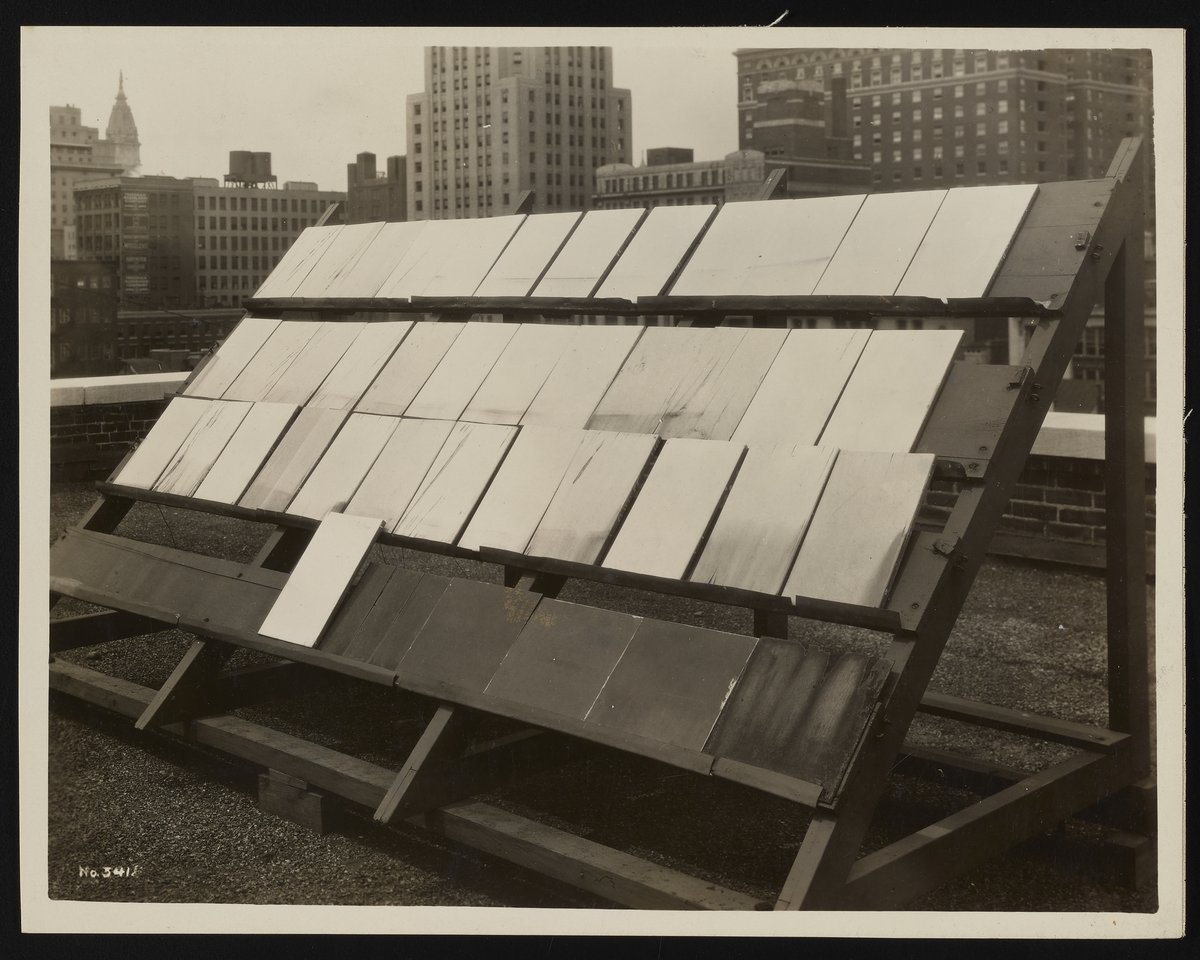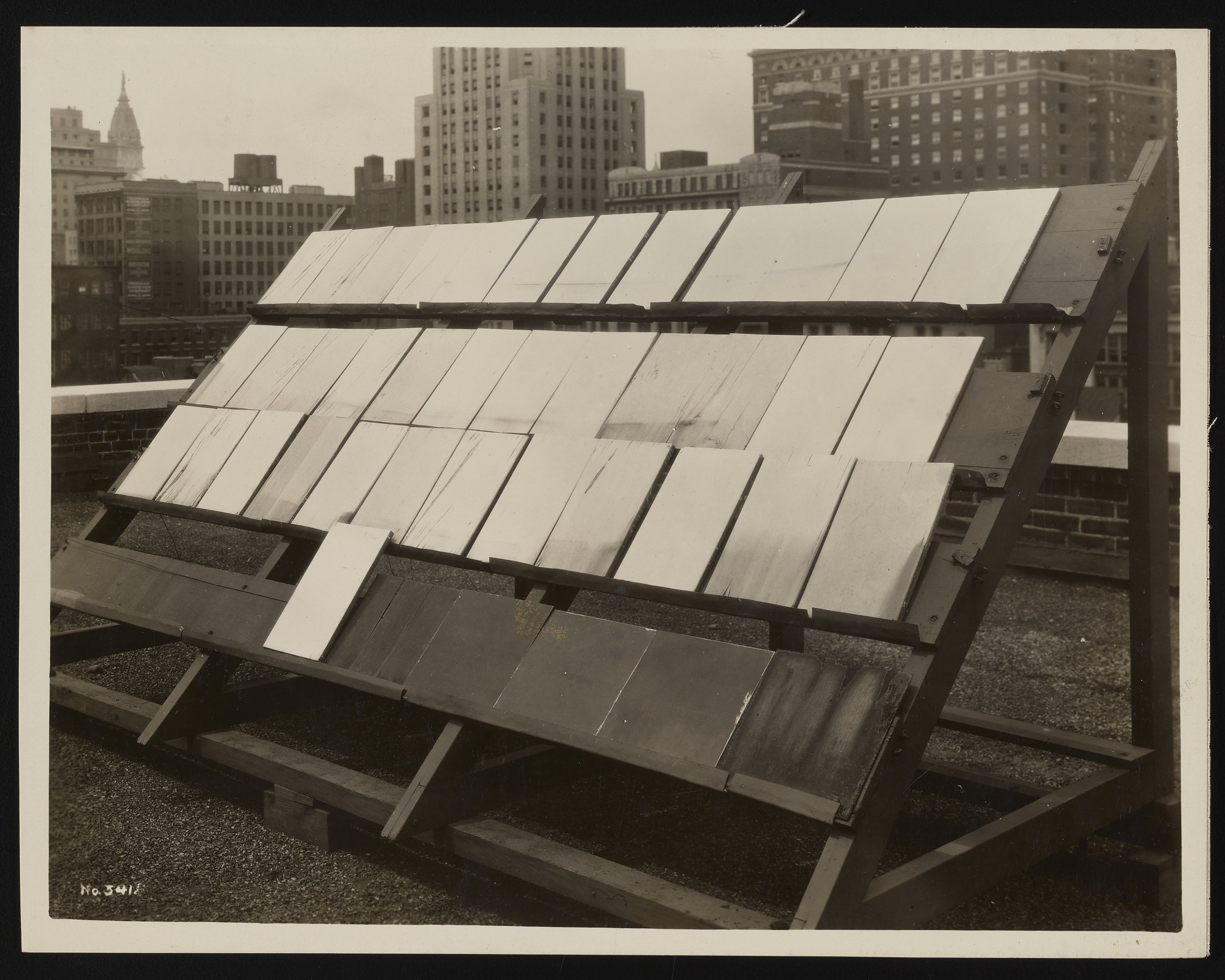 Rohm and Haas Company. “Exposure Racks at Rohm and Haas Home Office,” 1930–1939. Rohm & Haas Company Archives, Box Photos 2, Folder 1. Science History Institute. Philadelphia. https://digital.sciencehistory.org/works/3nog1fg.