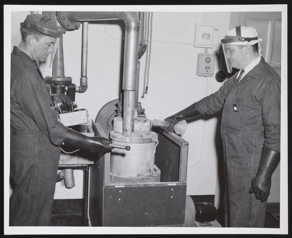 View of chemist George Wieczorek (right) and an unidentified chemist using a Geiger counter to measure ionizing radiation in an unknown substance at a U.S. Department of Agriculture facility. The U.S.D.A. commonly used radioactive material for a variety of research and testing, including the study of radioactive substances as fertilizer, as well as to model the impacts of radioactive material in soil and test the effectiveness of new insect control techniques or materials.