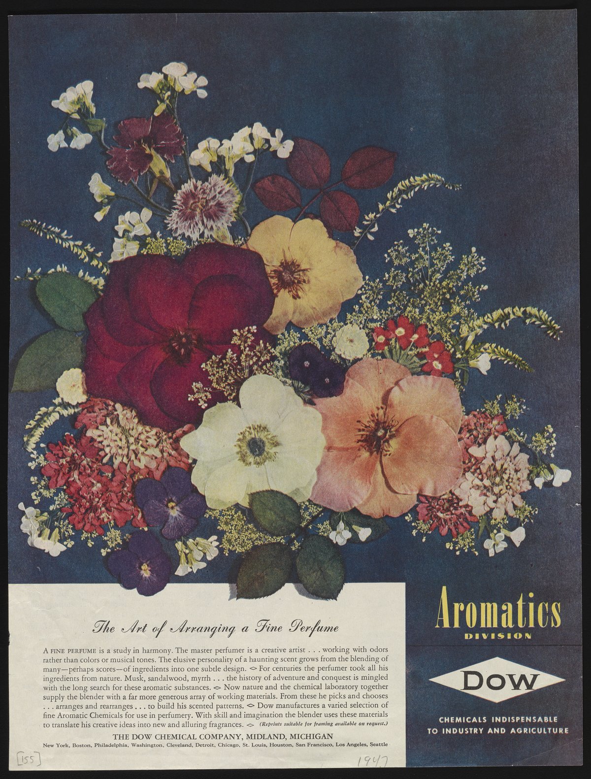 Color print advertisement for the Aromatics Division of the Dow Chemical Company featuring an arrangement of dried flowers. The accompanying text reflects upon the work of master perfumers to mix and blend scents and details the use of Dow aromatic chemicals to create new and alluring fragrances. This advertisement appeared in the January 18, 1947 edition of The Saturday Evening Post.