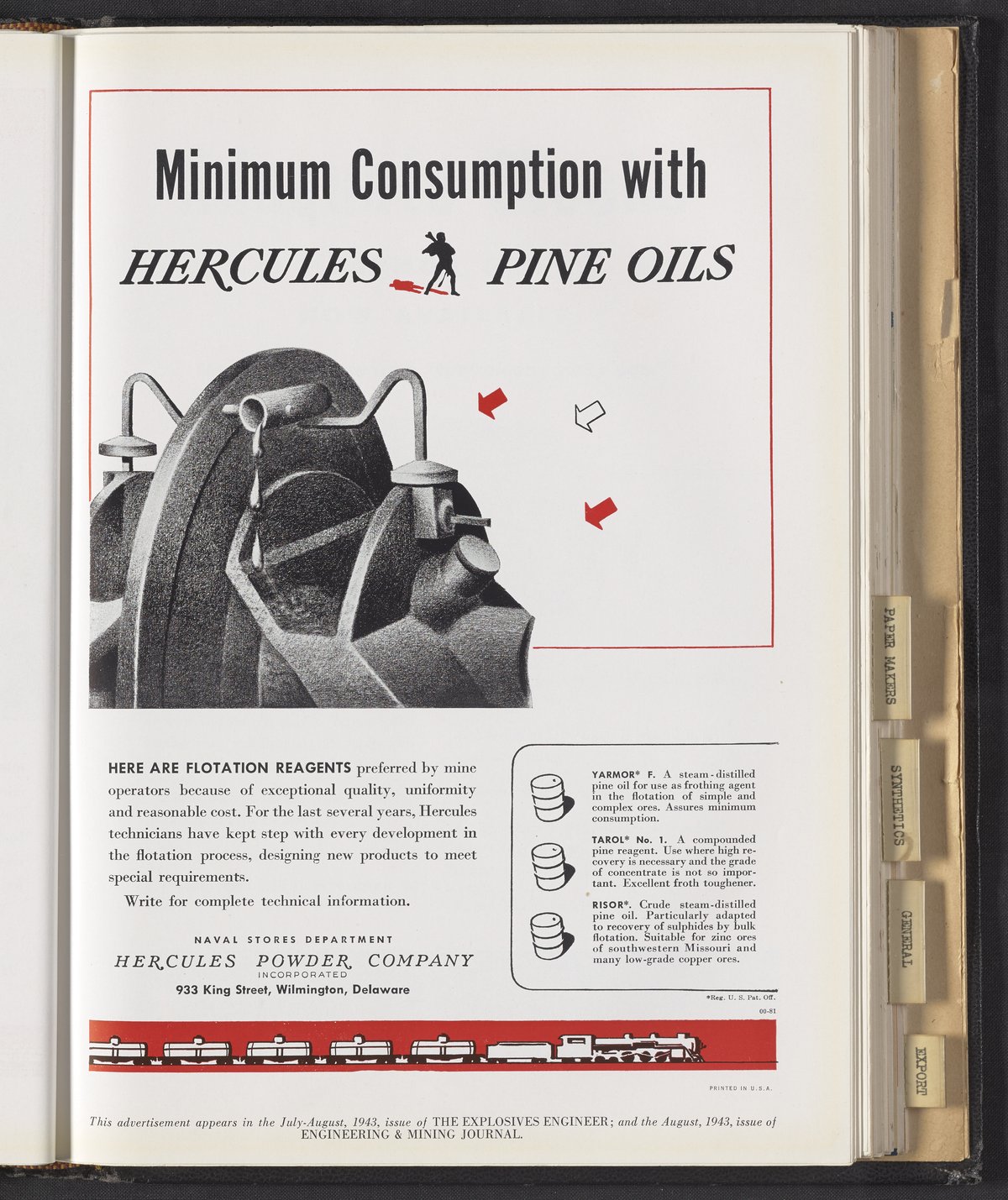 Hercules Incorporated. “Minimum Consumption with Hercules Pine Oils.” 1943 Hercules Advertisements, 1943. Records of Hercules Incorporated, Volume 1943. Science History Institute. Philadelphia. https://digital.sciencehistory.org/works/3t945r557.