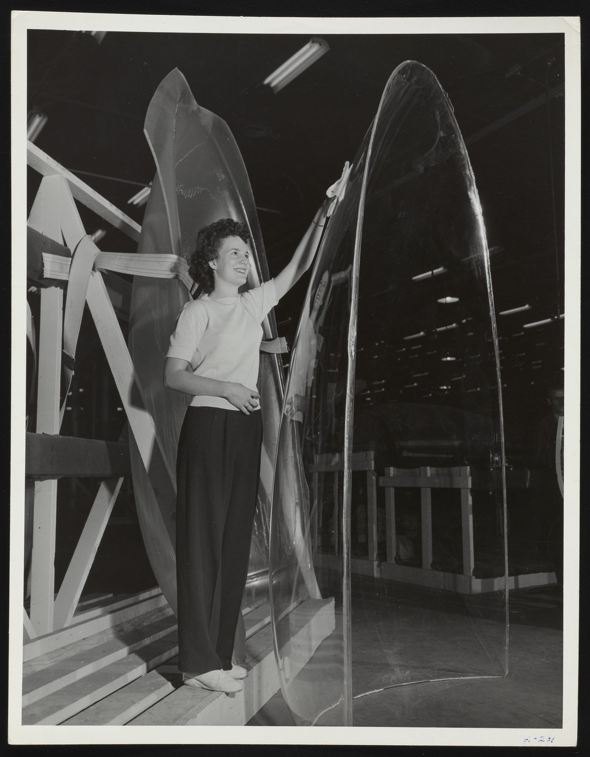 General view of an unidentified female employee polishing a curved panel of Plexiglas designed for use as an aircraft windshield. This photograph was likely taken at the Rohm and Haas Company plant located in Bristol, Pennsylvania.