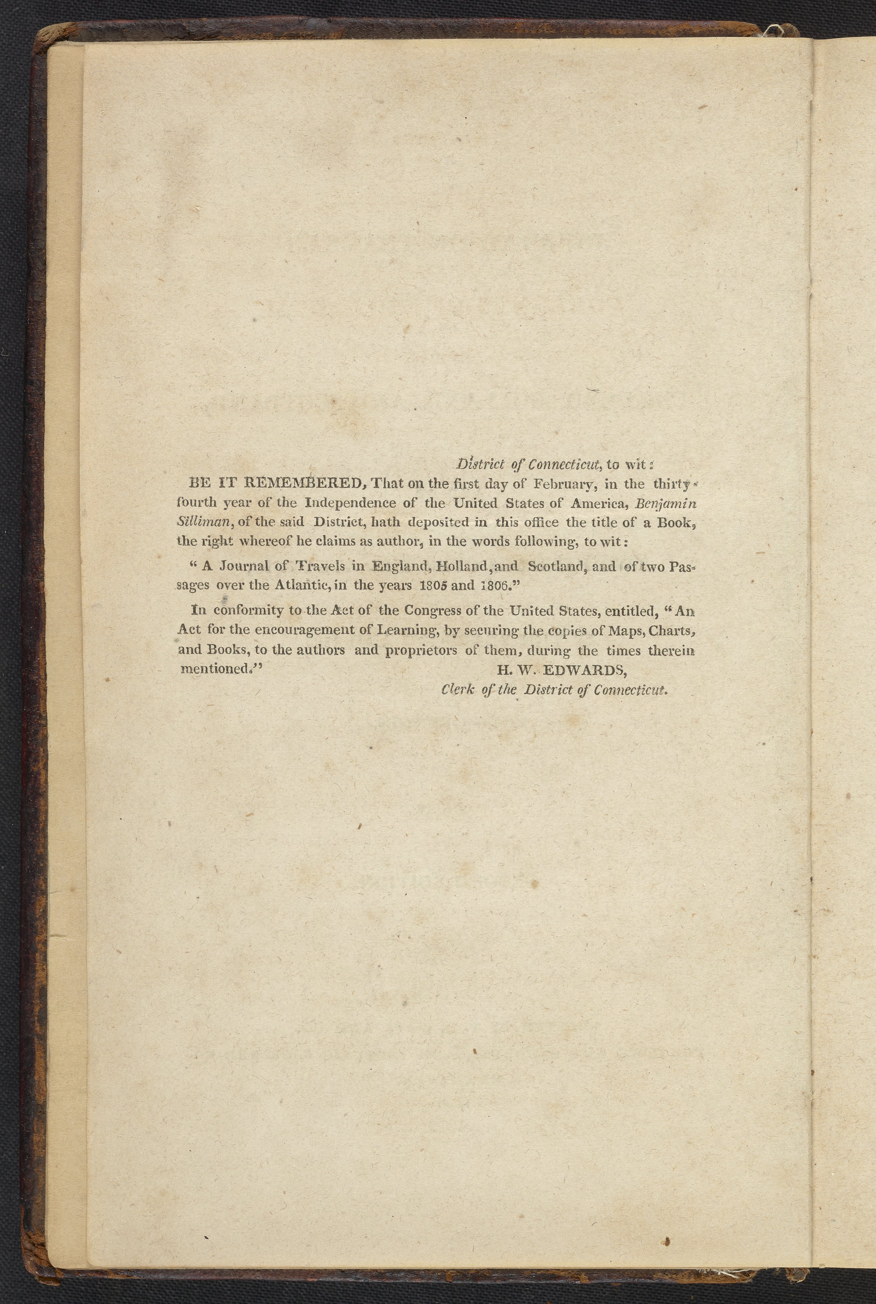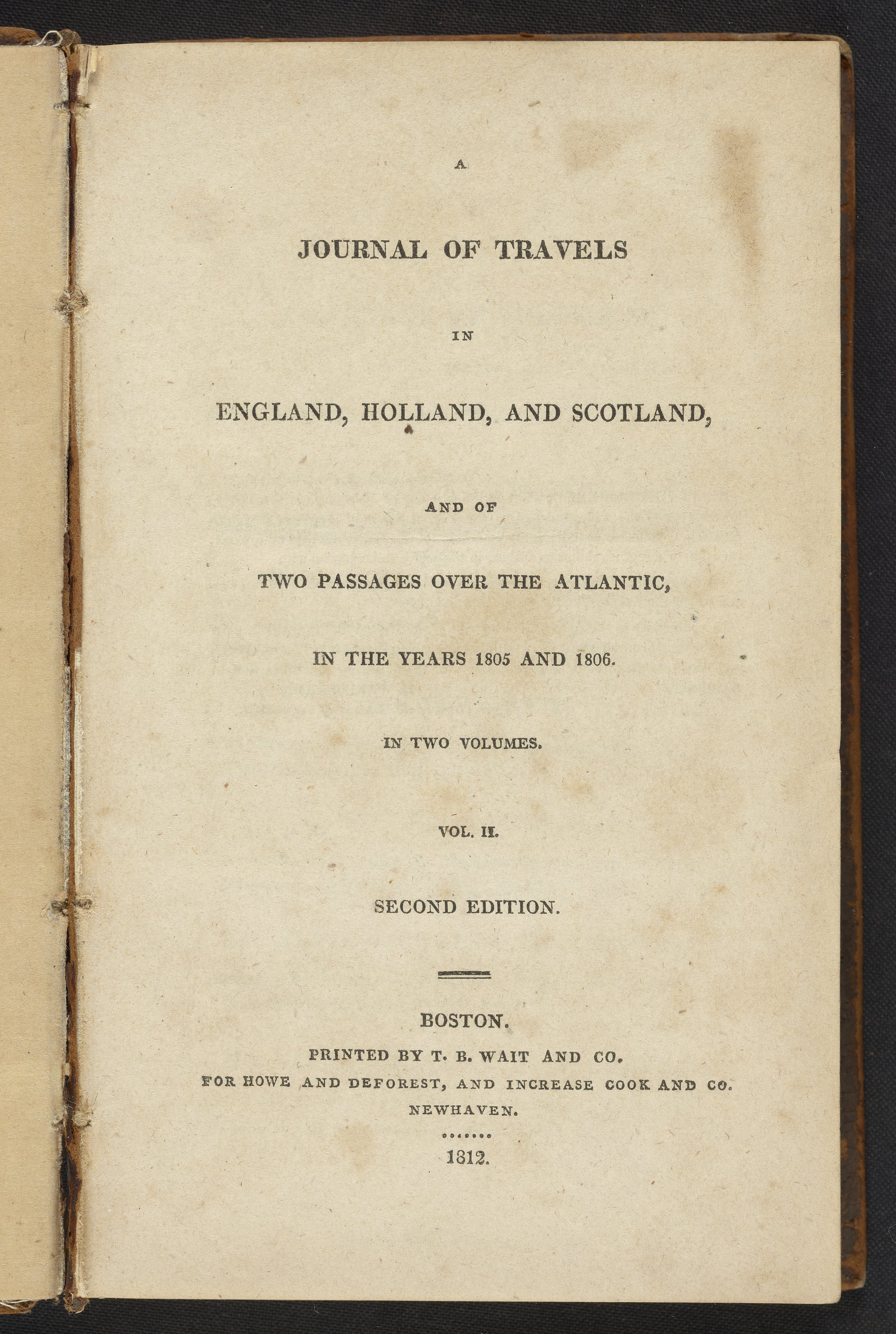 Silliman, Benjamin. A Journal of Travels in England, Holland and Scotland, and of Two Passages Over the Atlantic, in the Years 1805 and 1806, Vol. 2. New York, New York: Ezra Sargeant, 1812. https://digital.sciencehistory.org/works/3uuqmpx.