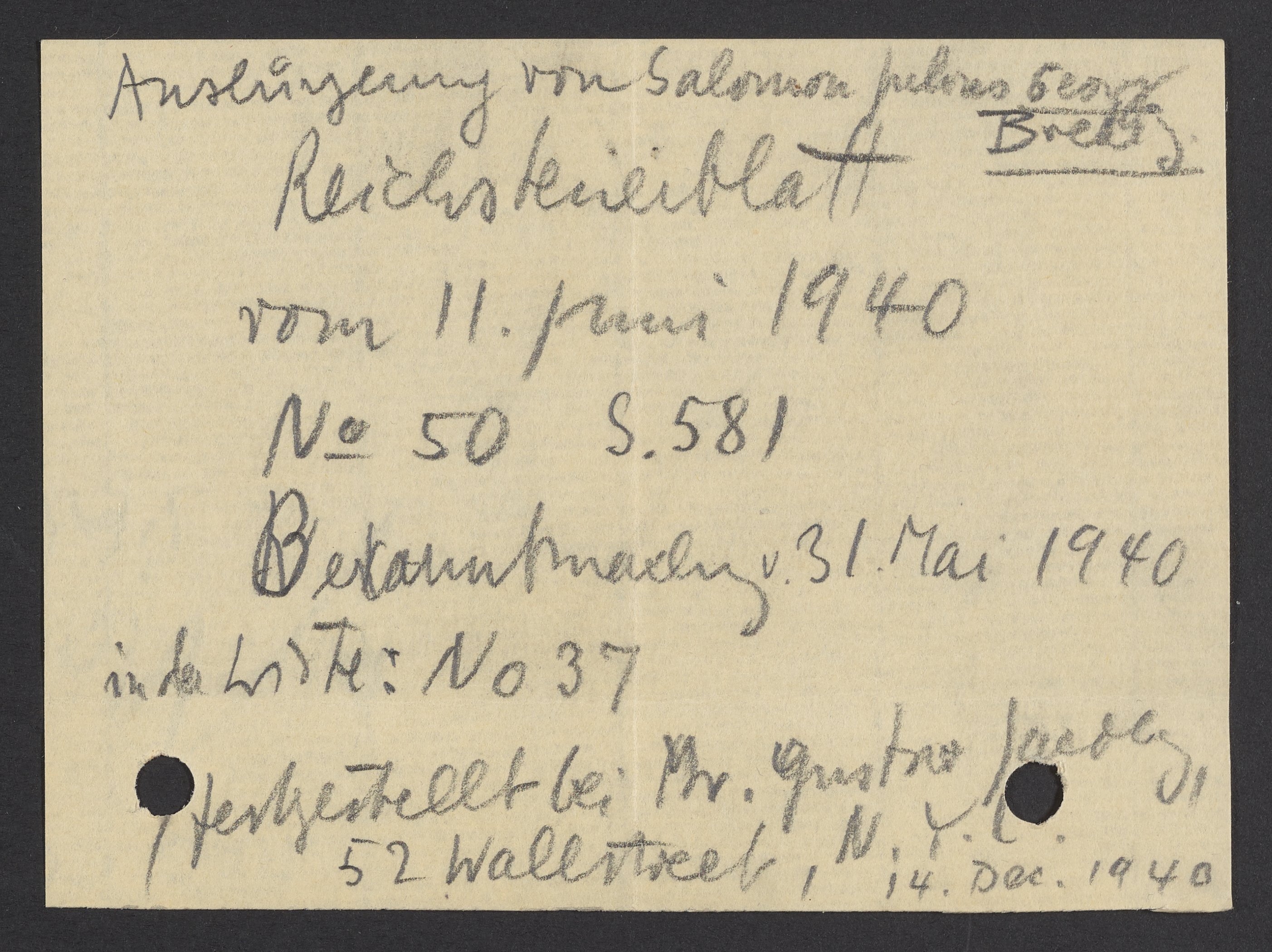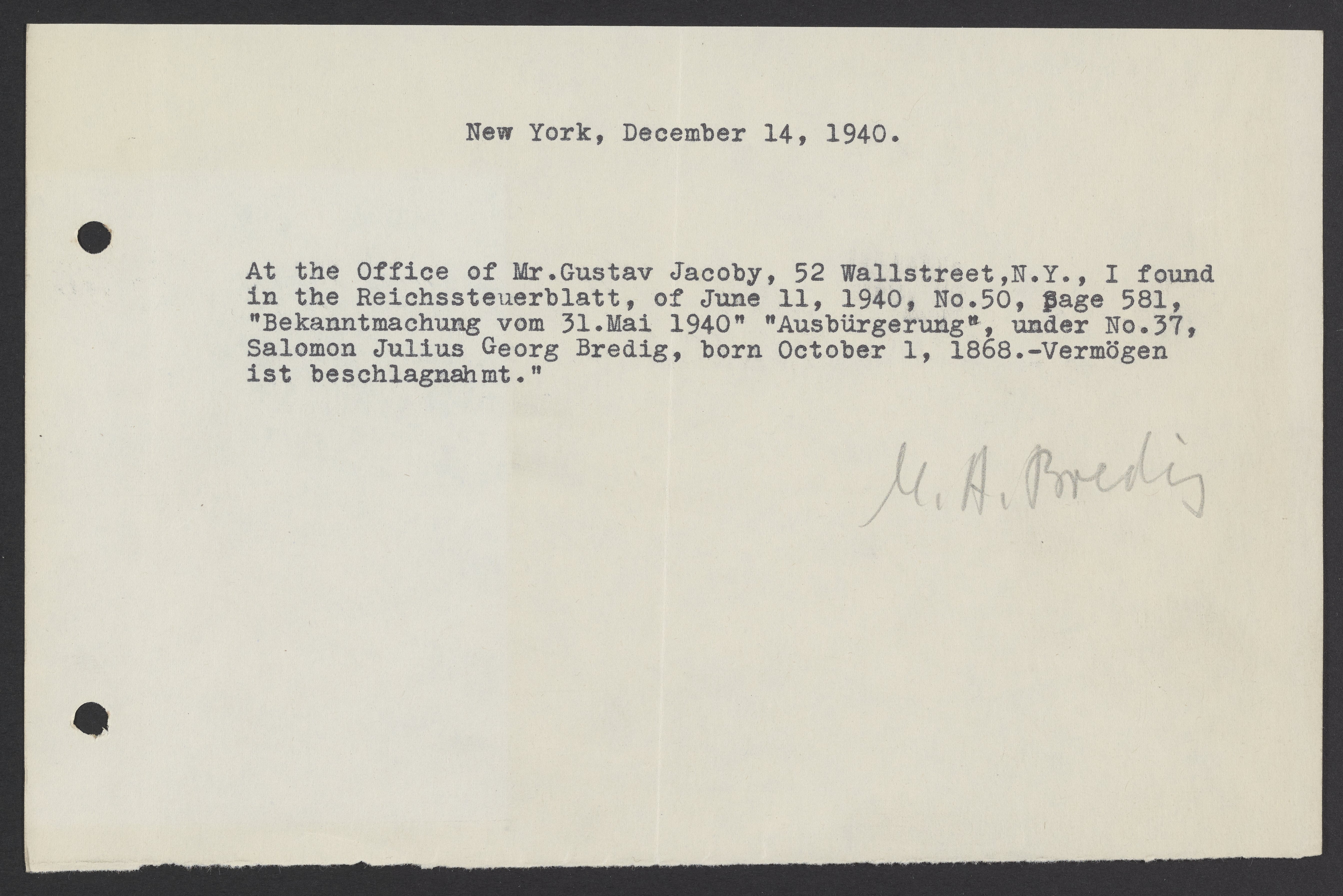 Bredig, Max Albert. “Note about Georg Bredig's Reichssteuerblatt,” December 14, 1940. Papers of Georg and Max Bredig, Box 8, Folder 25. Science History Institute. Philadelphia. https://digital.sciencehistory.org/works/3wj7cy3.
