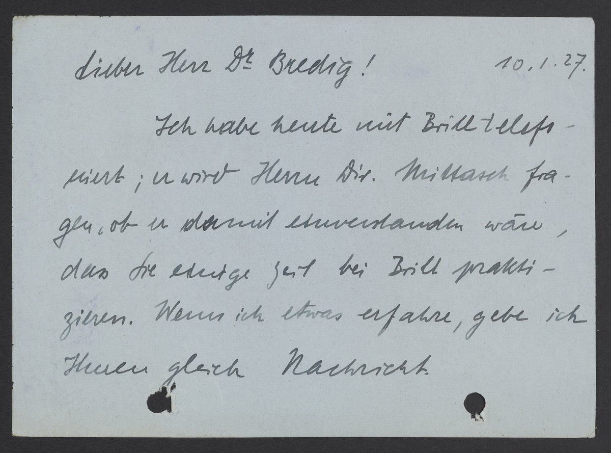 Ich habe heute mit Brill telefoniert; er wird Herrn Dir. Mittasch fragen, ob er damit einverstanden wäre, dass Sie einige Zeit bei Brill praktizieren. Wenn ich etwas erfahre, gebe ich Ihnen gleich Nachricht.