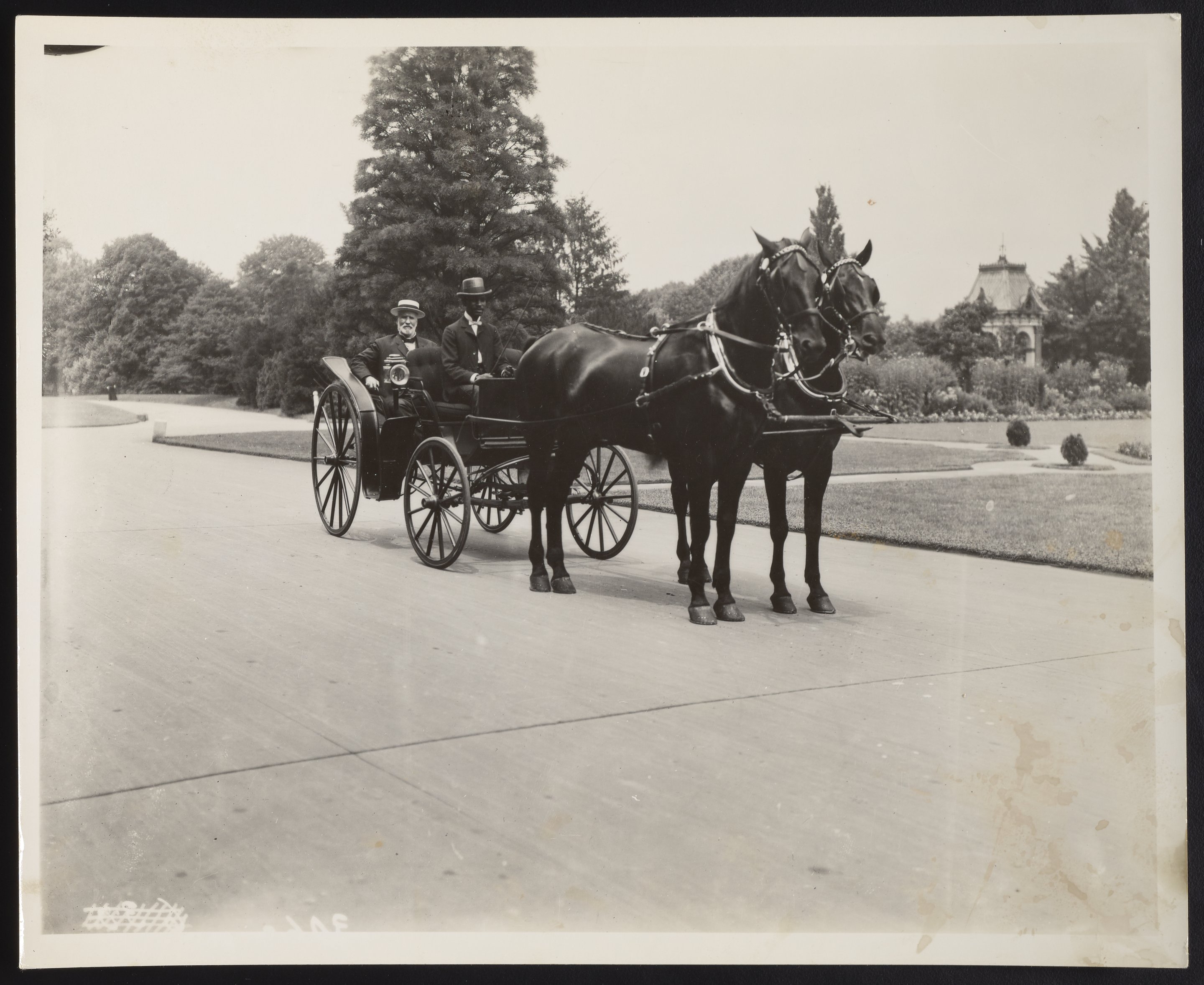 Photograph of James Wilson, Secretary of Agriculture from 1897 to 1913, seated in a horse-drawn carriage with an unidentified African American driver. Wilson's tenure as Secretary is regarded as a period distinguished by the modernization of agricultural methods, as well as the expansion of food inspection practices. Prior to his tenure as Secretary, Wilson was a professor of agriculture at Iowa State Agricultural College (now Iowa State University), where he advised George Washington Carver.