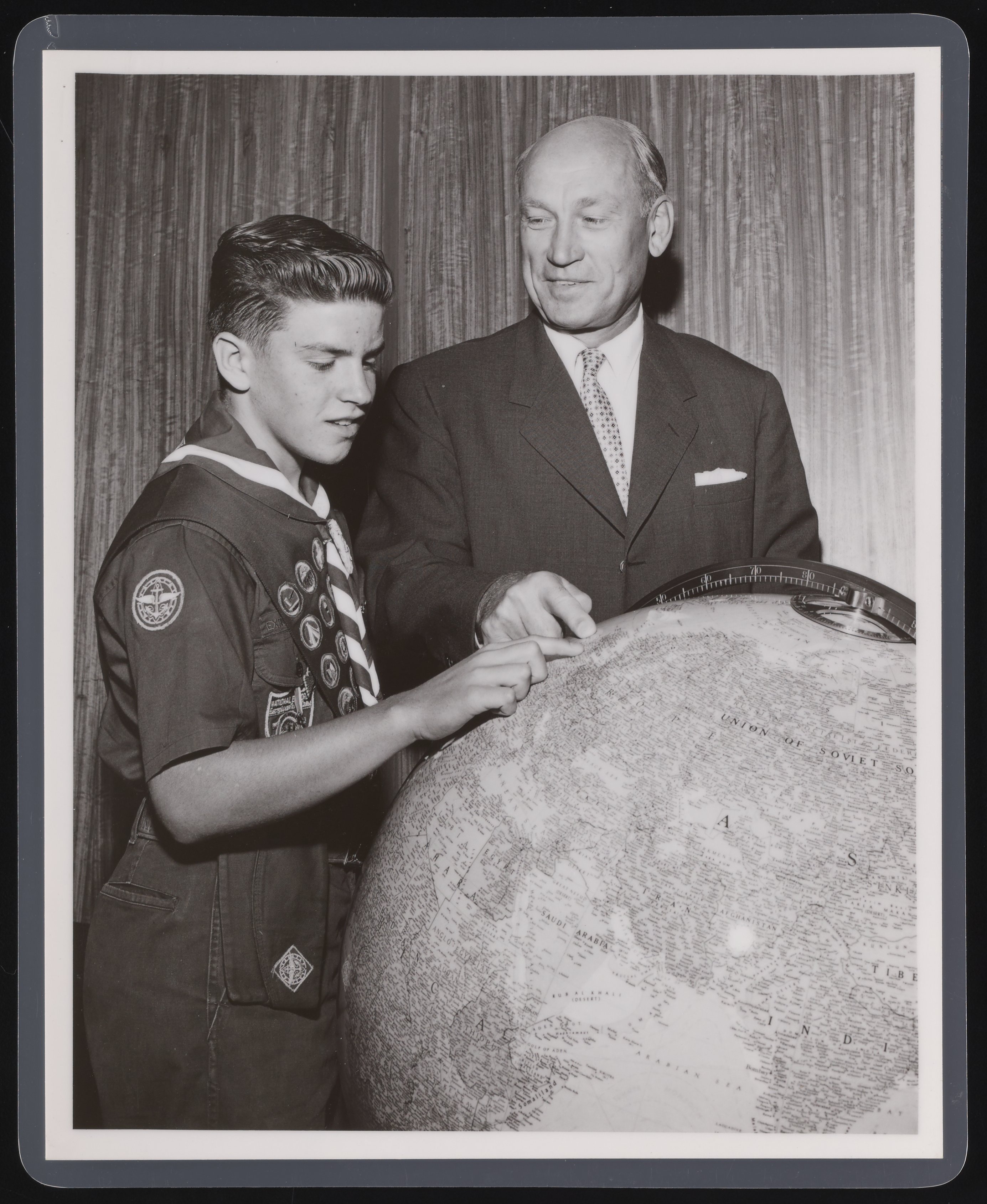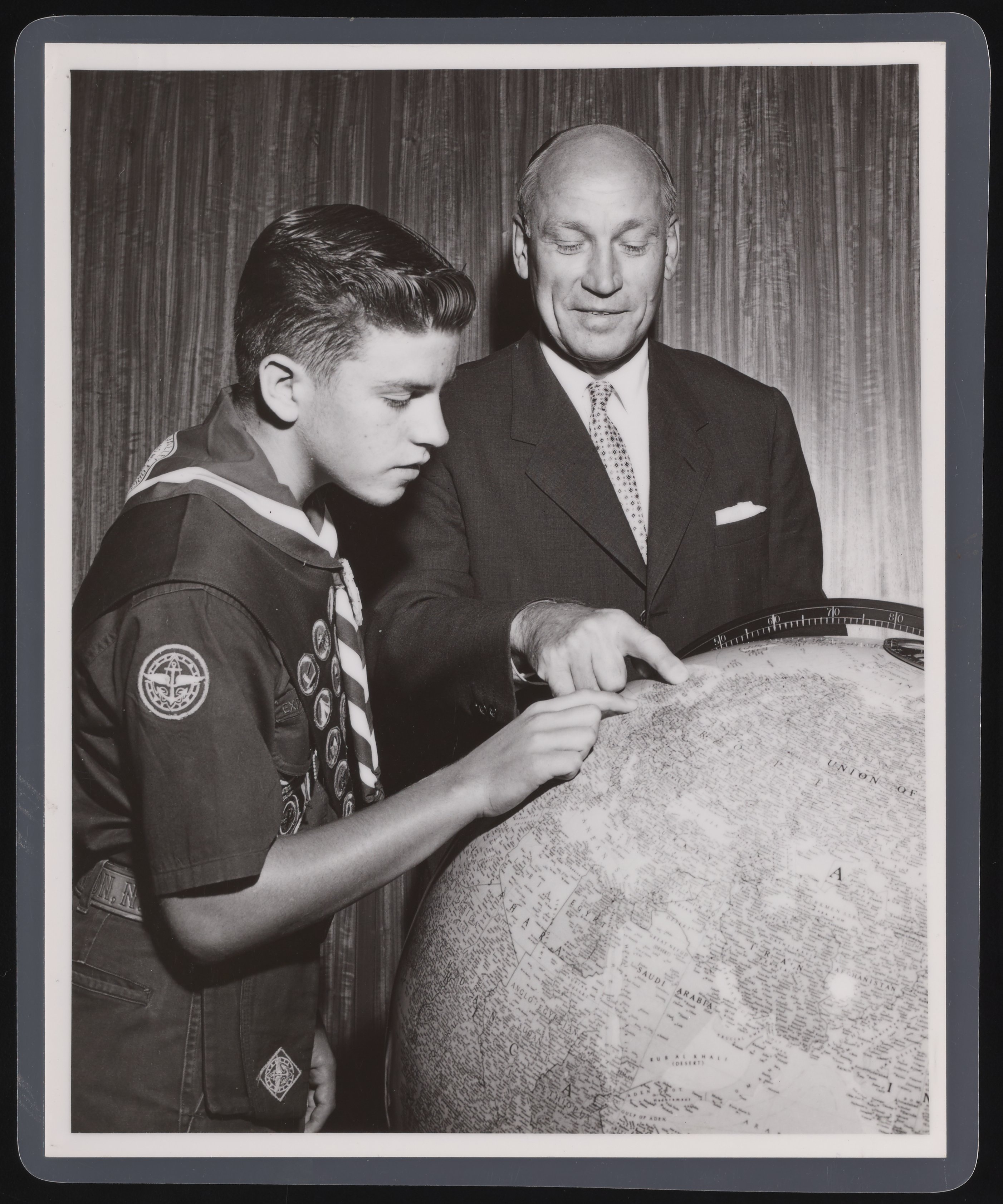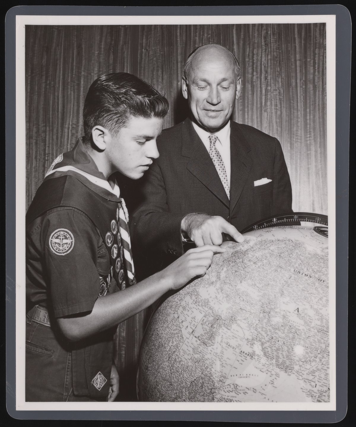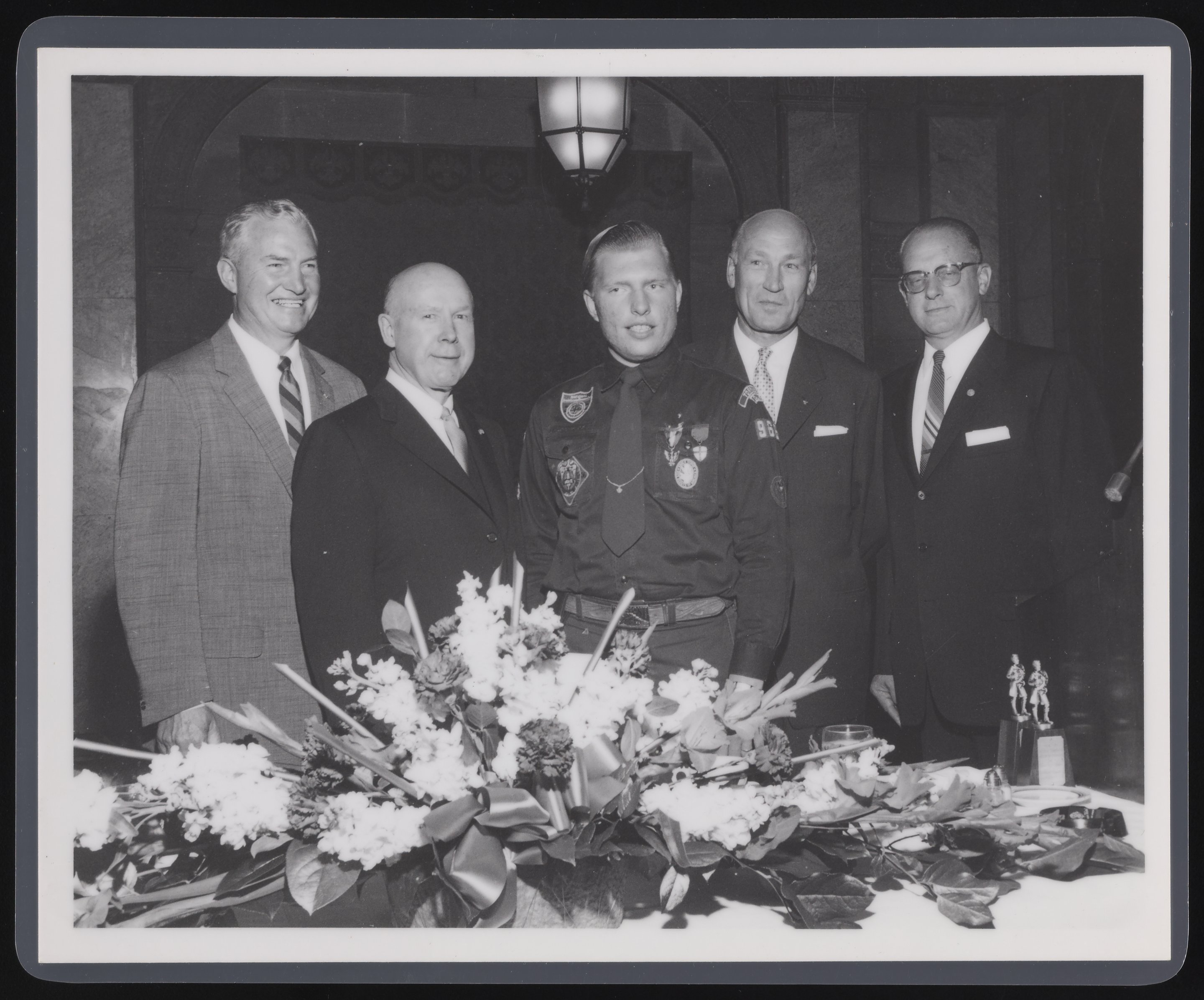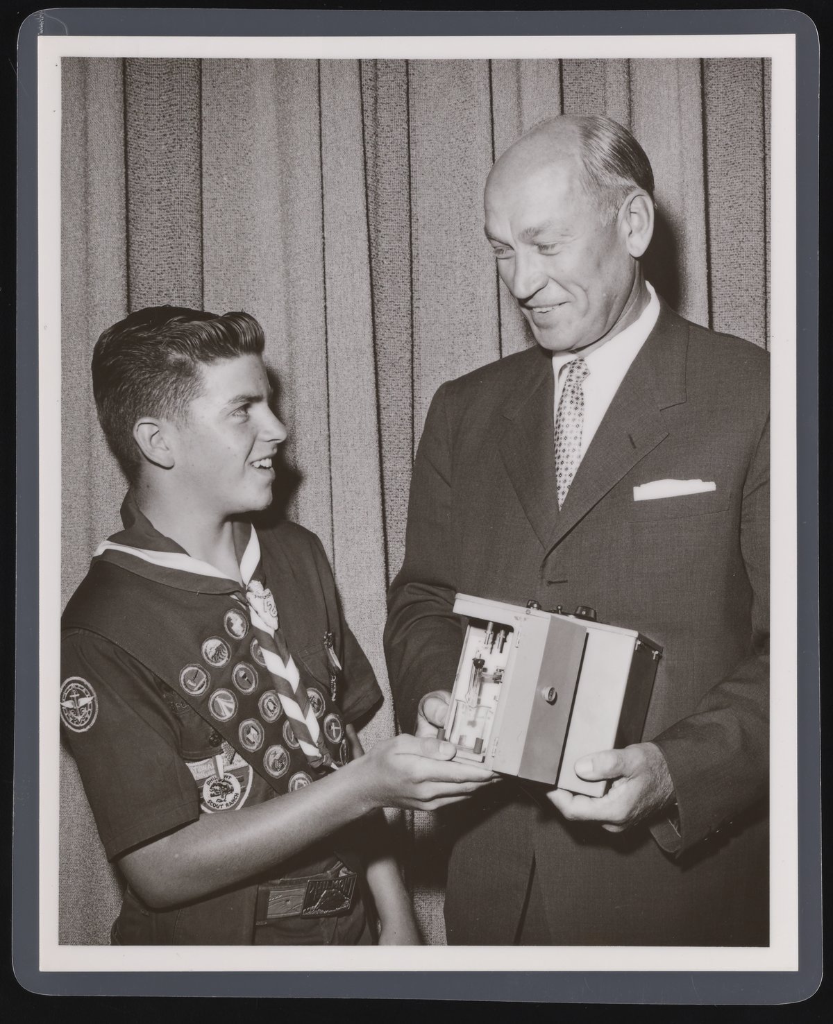 Rothschild Photo. “Arnold Beckman at an Eagle Scout Award Ceremony,” October 1957. Beckman Historical Collection, Box 56, Folder 57. Science History Institute. Philadelphia. https://digital.sciencehistory.org/works/3x816n083.