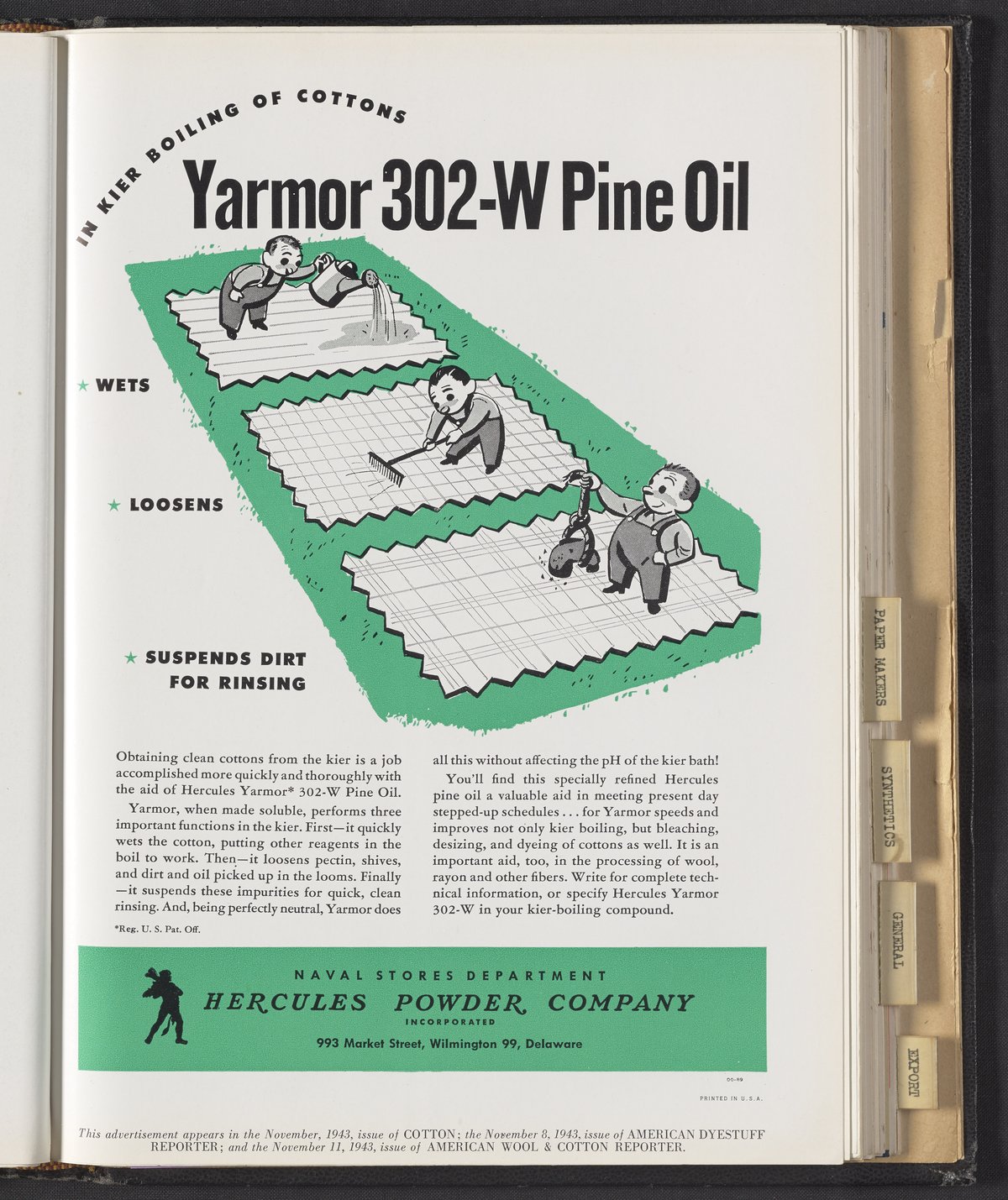 Hercules Incorporated. “In Kier Boiling of Cottons...Yarmor 302-W Pine Oil Wets, Loosens, Suspends Dirt for Rinsing.” 1943 Hercules Advertisements, 1943. Records of Hercules Incorporated, Volume 1943. Science History Institute. Philadelphia. https://digital.sciencehistory.org/works/3x816n368.