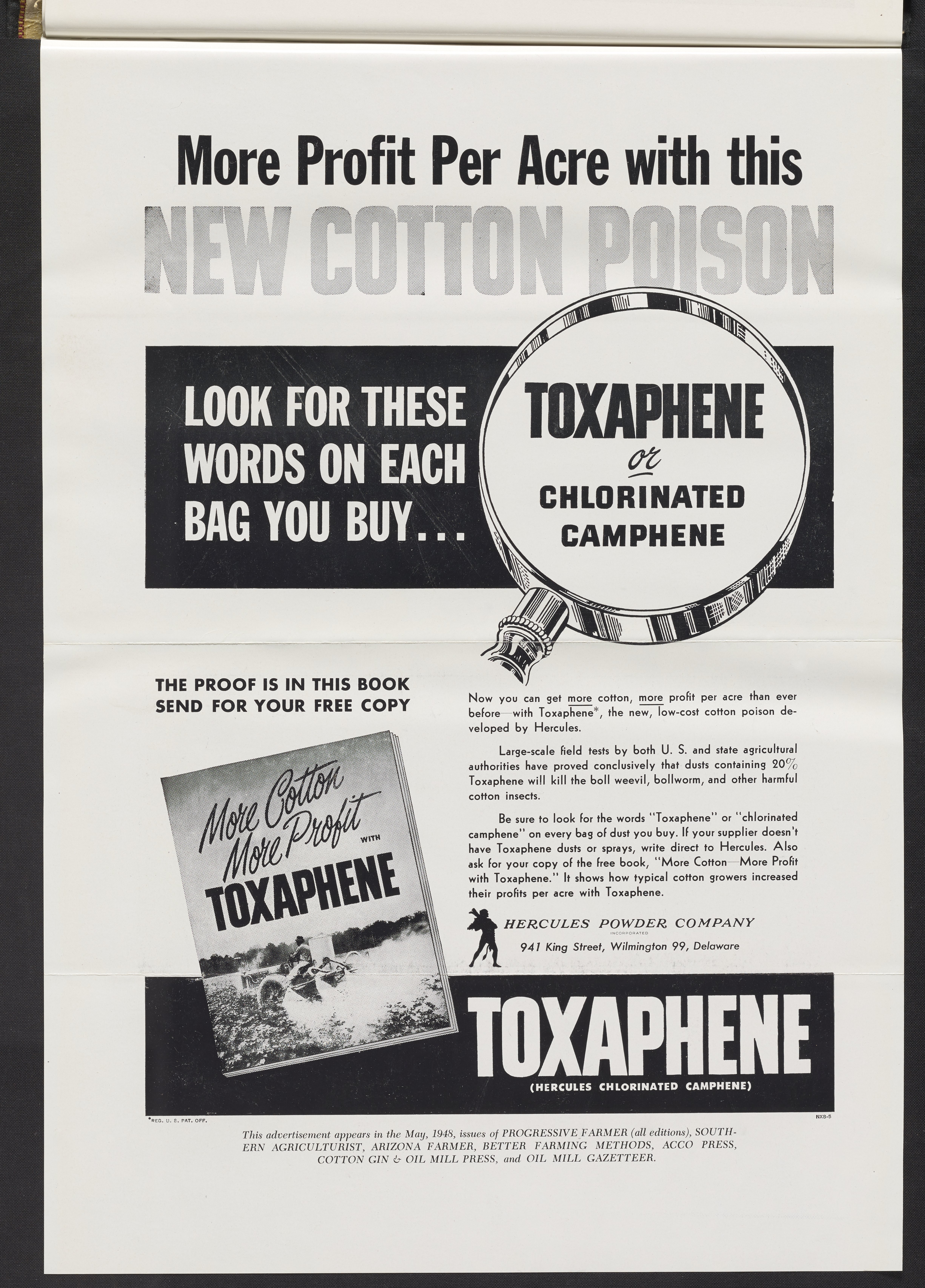 Hercules Incorporated. “More Profit Per Acre with This New Cotton Poison.” 1948 Hercules Advertisements, 1948. Records of Hercules Incorporated, Volume 1948. Science History Institute. Philadelphia. https://digital.sciencehistory.org/works/3x816n38t.