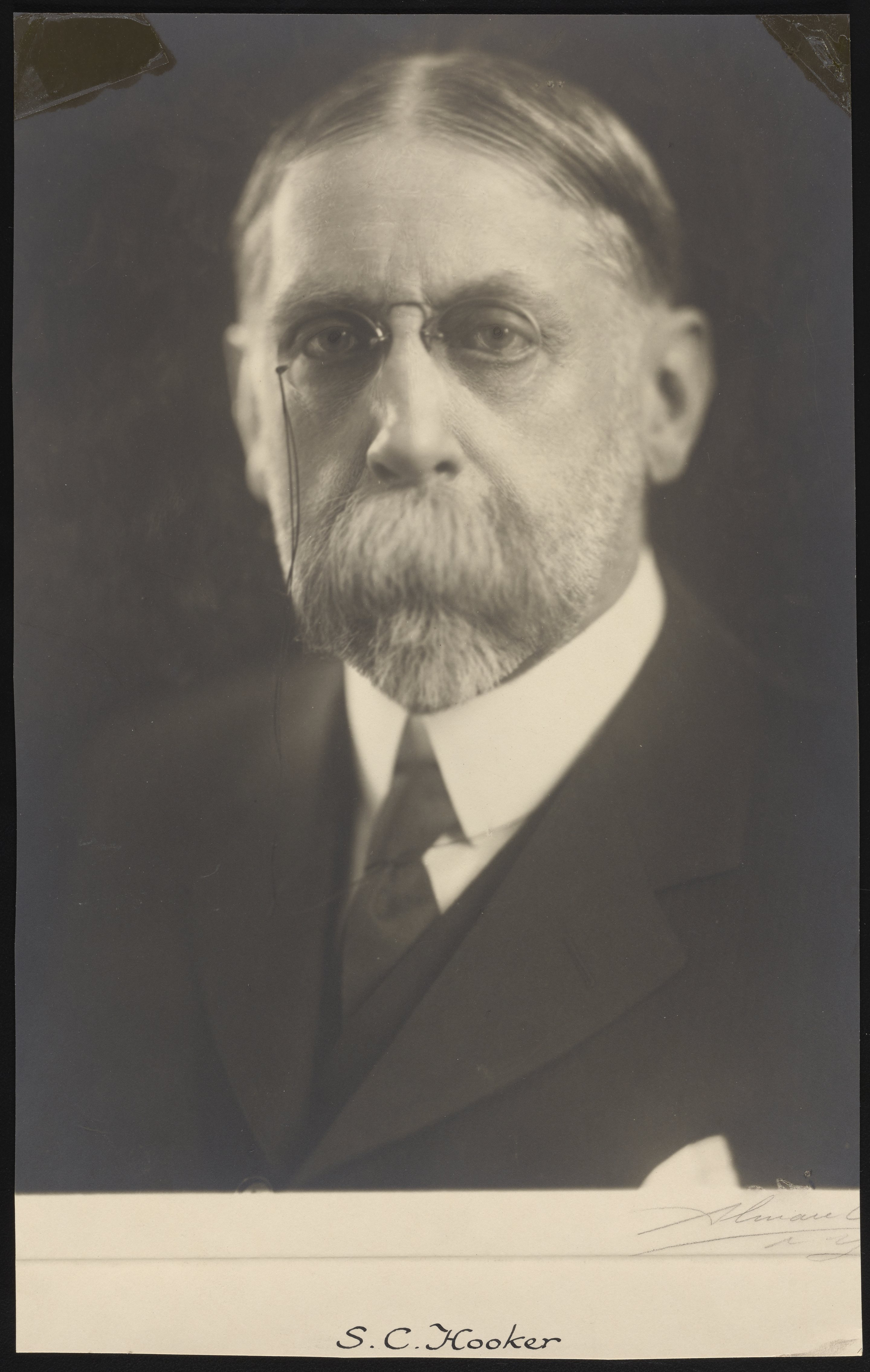 Portrait of Samuel Cox Hooker (1865-1935). Hooker was born on April 19, 1865, in Benchley, Kent, England and studied at the Government Science School in South Kensington, London. Hooker earned his PhD from the University of Munich in 1885 and subsequently immigrated to the United States, settling near Philadelphia. In Philadelphia, Hooker notably analyzed water pollution levels, eventually establishing a correlation between the disease epidemic in the Kensington neighborhood and the water being pumped from the Delaware River. Over the course of his career, Hooker also extensively wrote on sugar manufacturing and refining and was instrumental in developing a method for recovering sugar from beet-molasses, as well as served on the board of directors for the American Sugar Refining Co. Samuel Cox Hooker died in Brooklyn, New York on October 12, 1935.