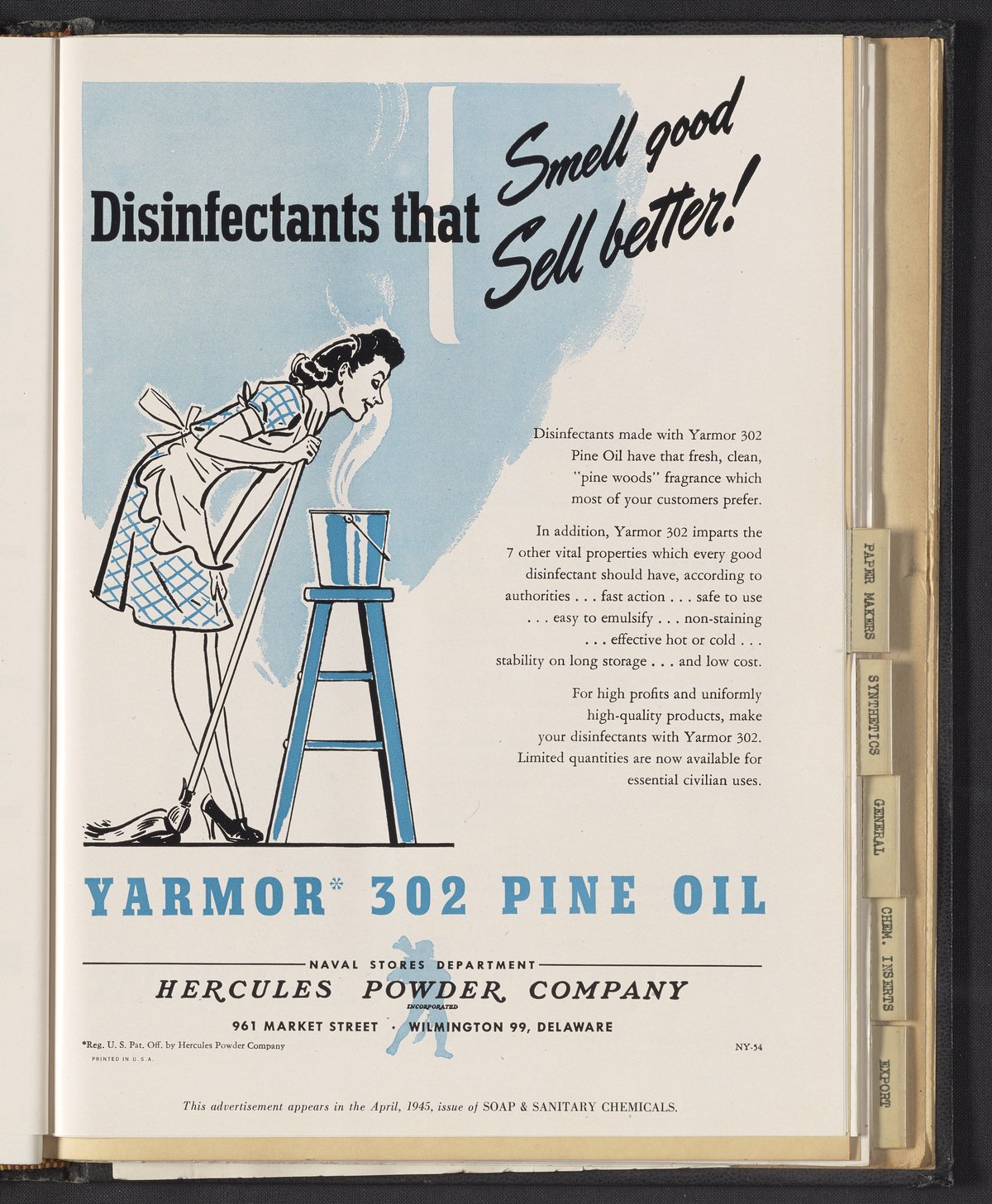 Advertisement for Yarmor 302 Pine Oil manufactured and sold by the Hercules Powder Company for use in disinfectants. The advertisement features an illustration of a housewife leaning over a mop bucket to inhale the disinfectant's fresh, clean "pine woods" fragrance. This advertisement appeared in the April 1945 issue of Soap & Sanitary Chemicals.