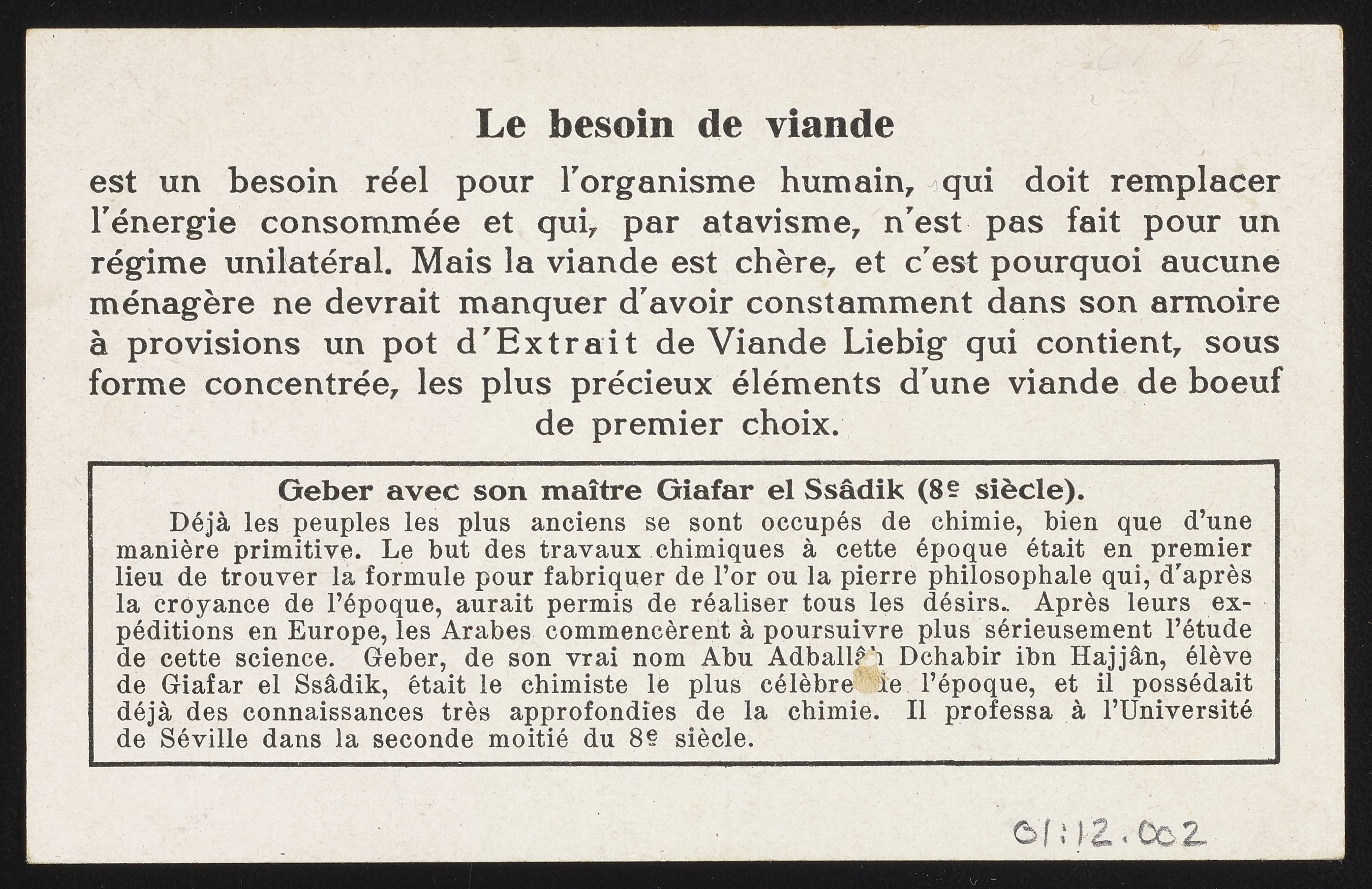 Trade card for Extrait de Viande de la Cie Liebig [Liebig Meat Extract Company]